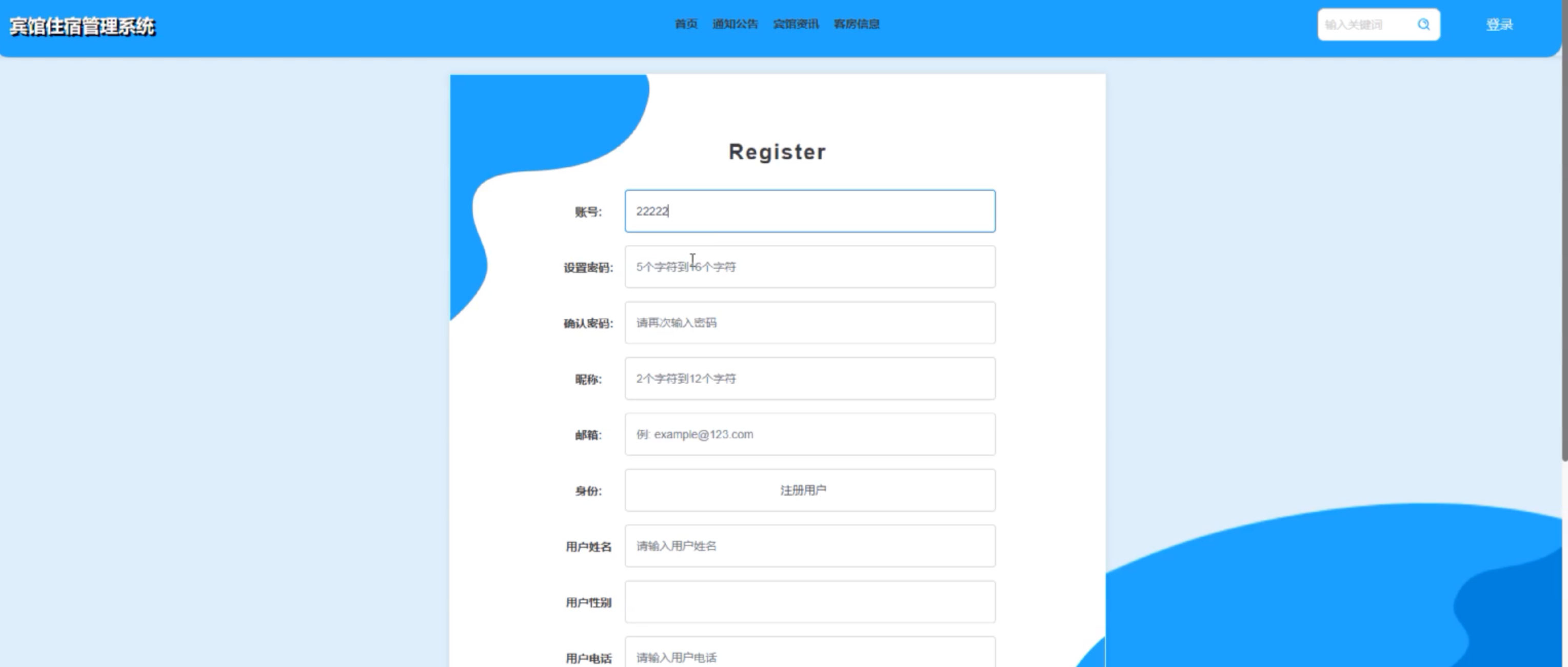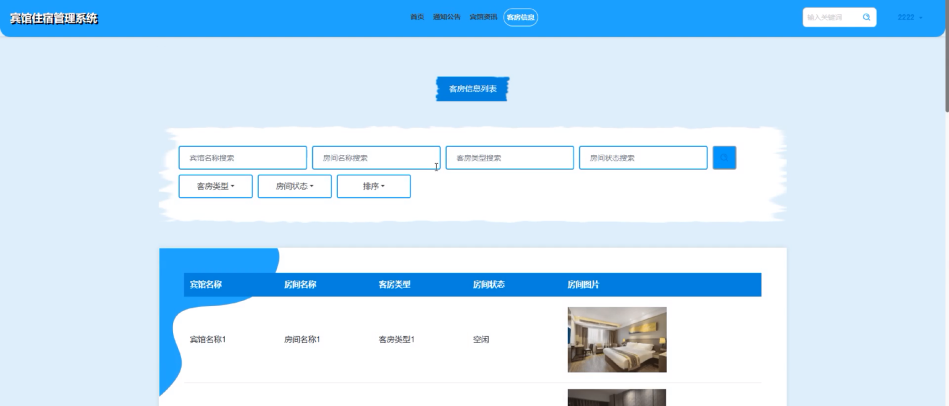 (2)首页:用户进入宾馆住宿管理系统的时候,首先映入眼帘的是系统的首页、通知公告、宾馆资讯、客房信息等信息。