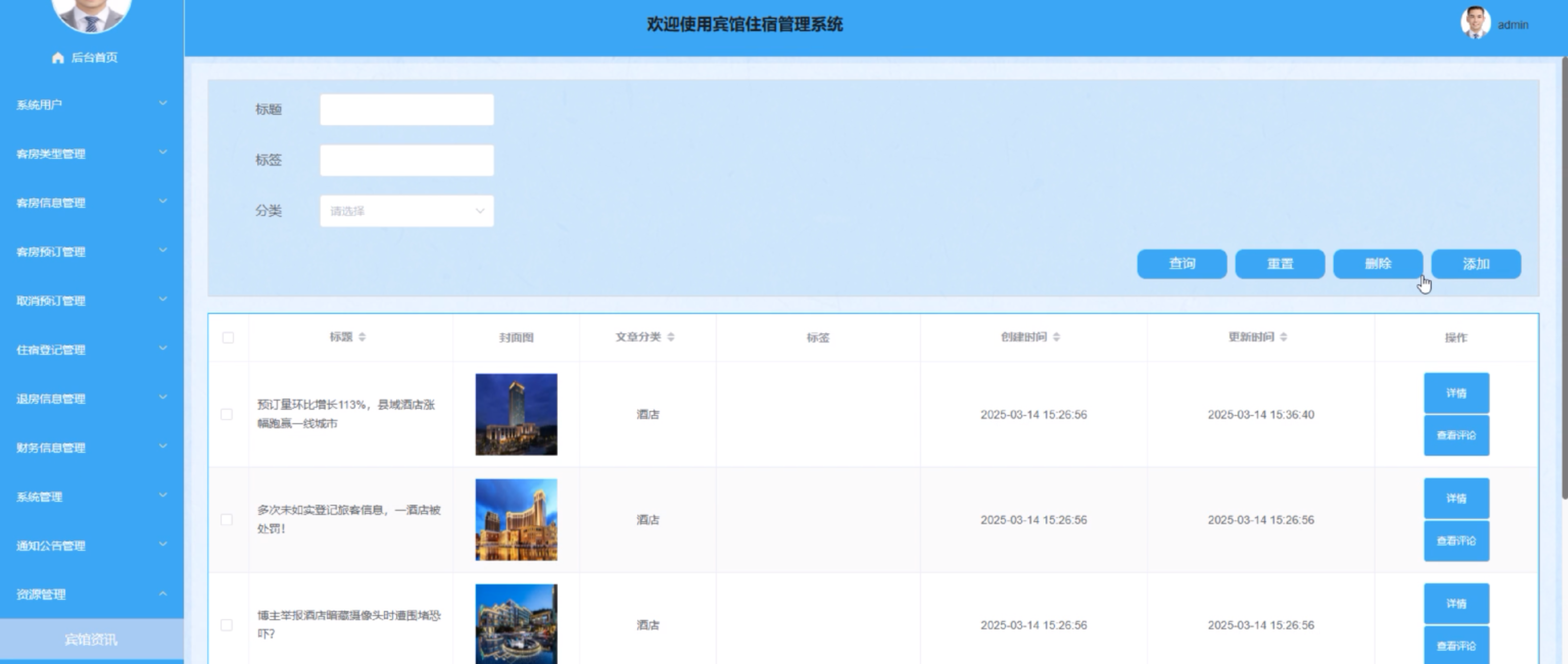 (13)资源管理:管理员点击可查看宾馆资讯和资讯分类;如需添加新的资讯,点击“添加”按钮,上传封面图,输入标题,选择分类,输入标签、描述和正文,点击“确认”按钮进行添加。同时可对资讯和分类进行增删改查。