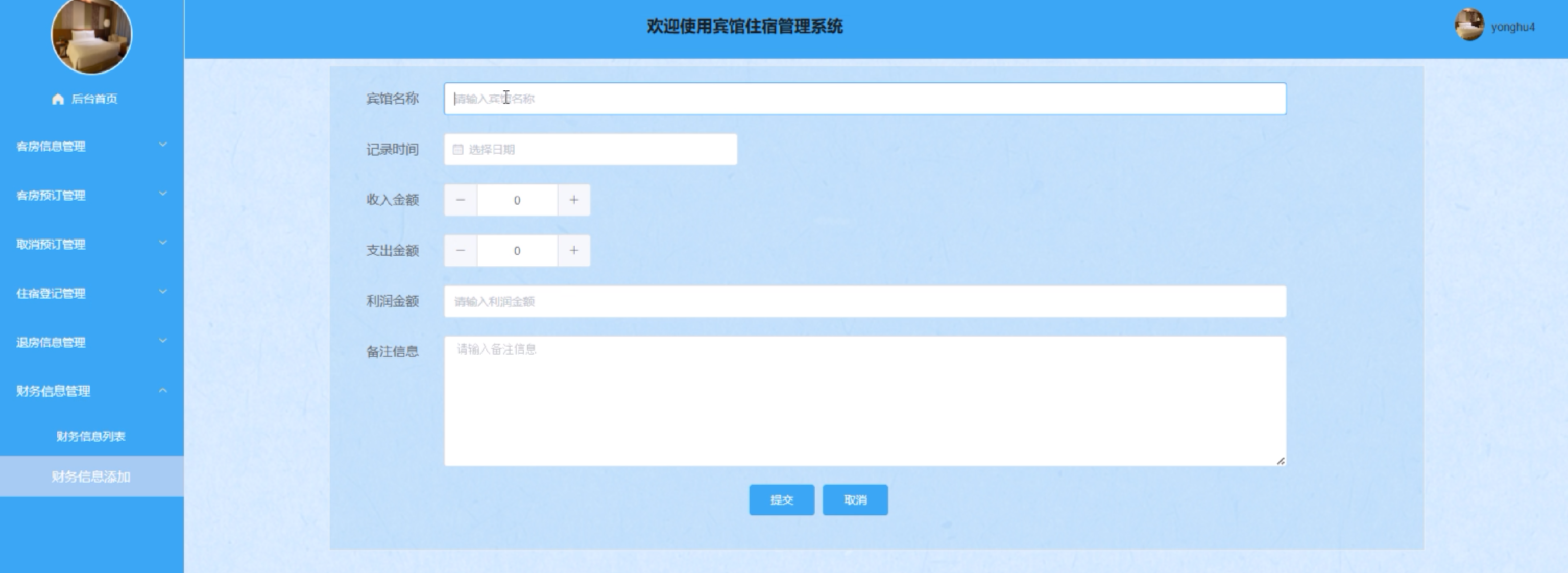 (8)财务信息管理:前台用户点击可查看财务信息列表和财务信息添加;点击进入“财务信息添加”可填写相关信息,包括宾馆名称、记录时间、收入金额、支出金额、利润金额、备注信息。