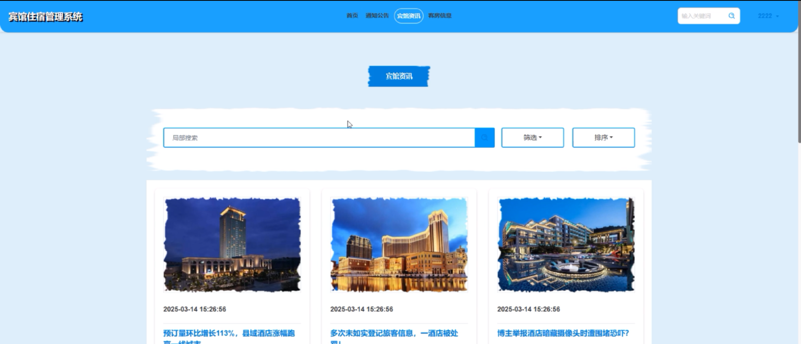 | 预期结果 | 页面显示包含有搜索关键字的宾馆资讯 |