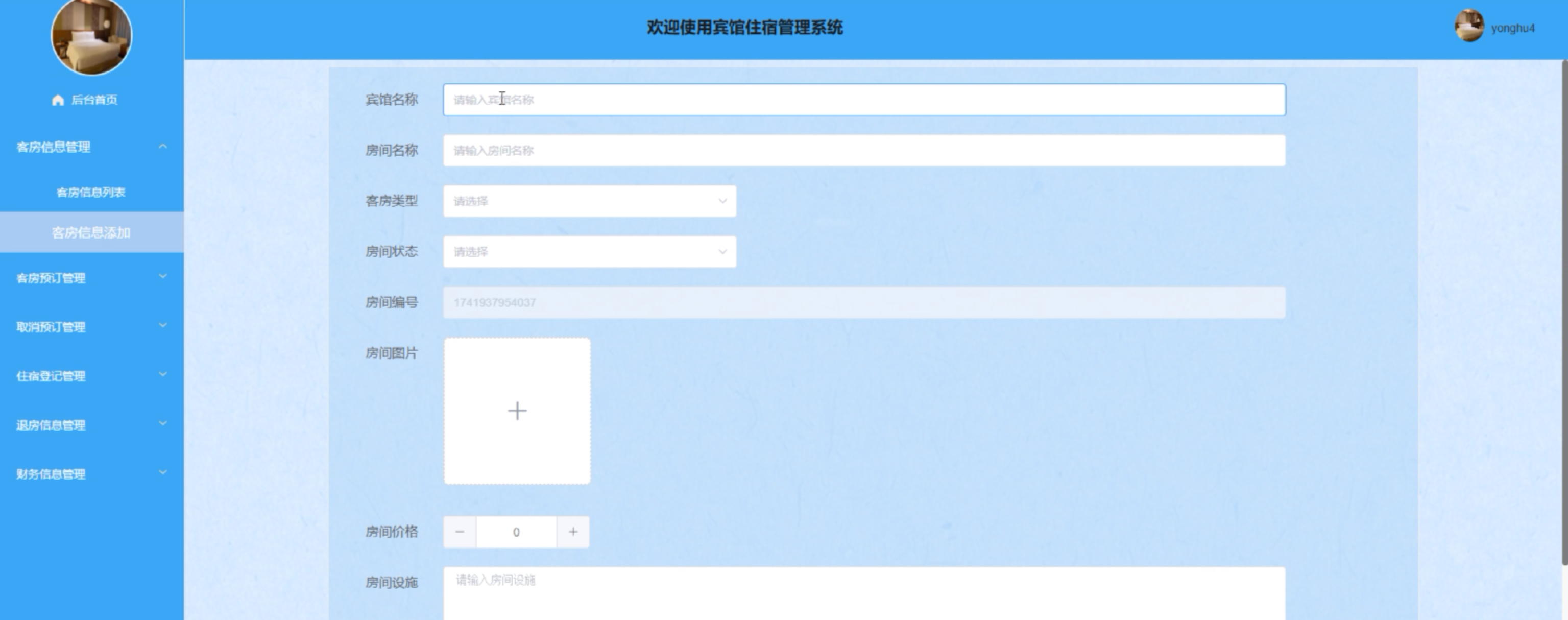 (3)客房信息管理:前台用户点击可查看客房信息列表和客房信息添加;点击进入“客房信息添加”可填写相关信息,包括宾馆名称、房间名称、客房类型、房间状态、房间编号、房间图片、房间价格、房间设备。