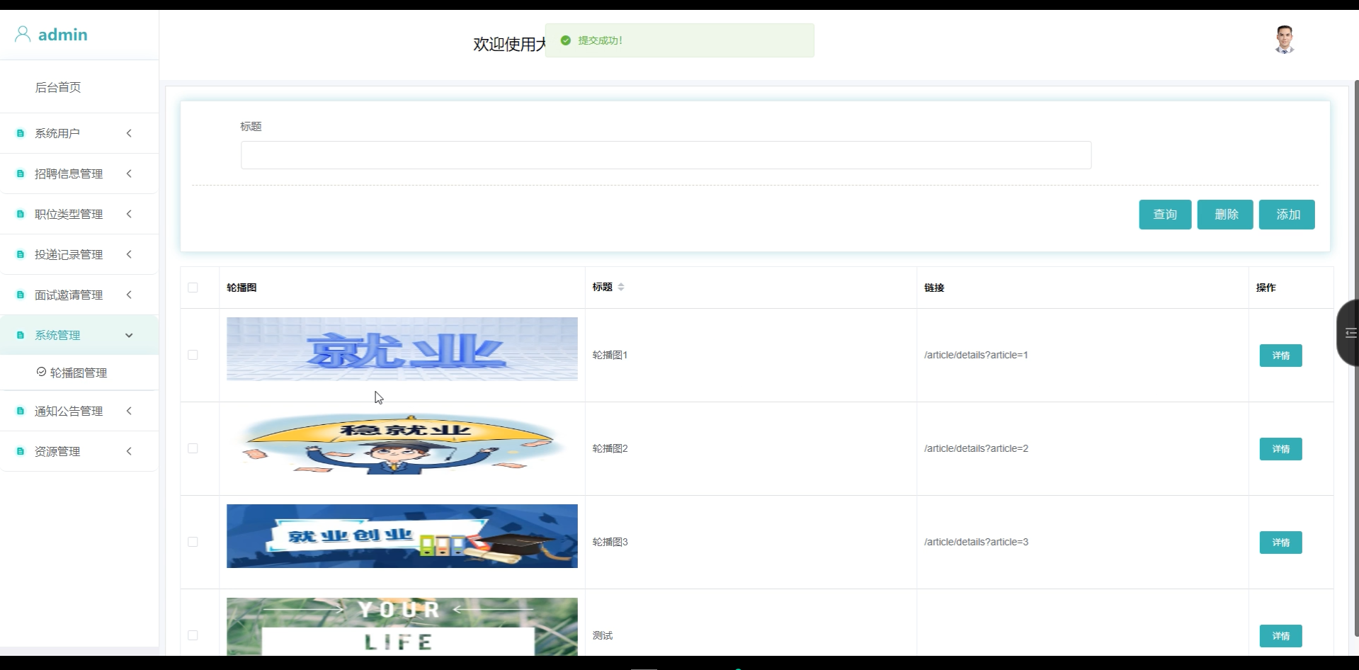 管理员点击“系统管理”菜单,可以对前台展示的轮播图进行设置,系统管理界面如下图所示。