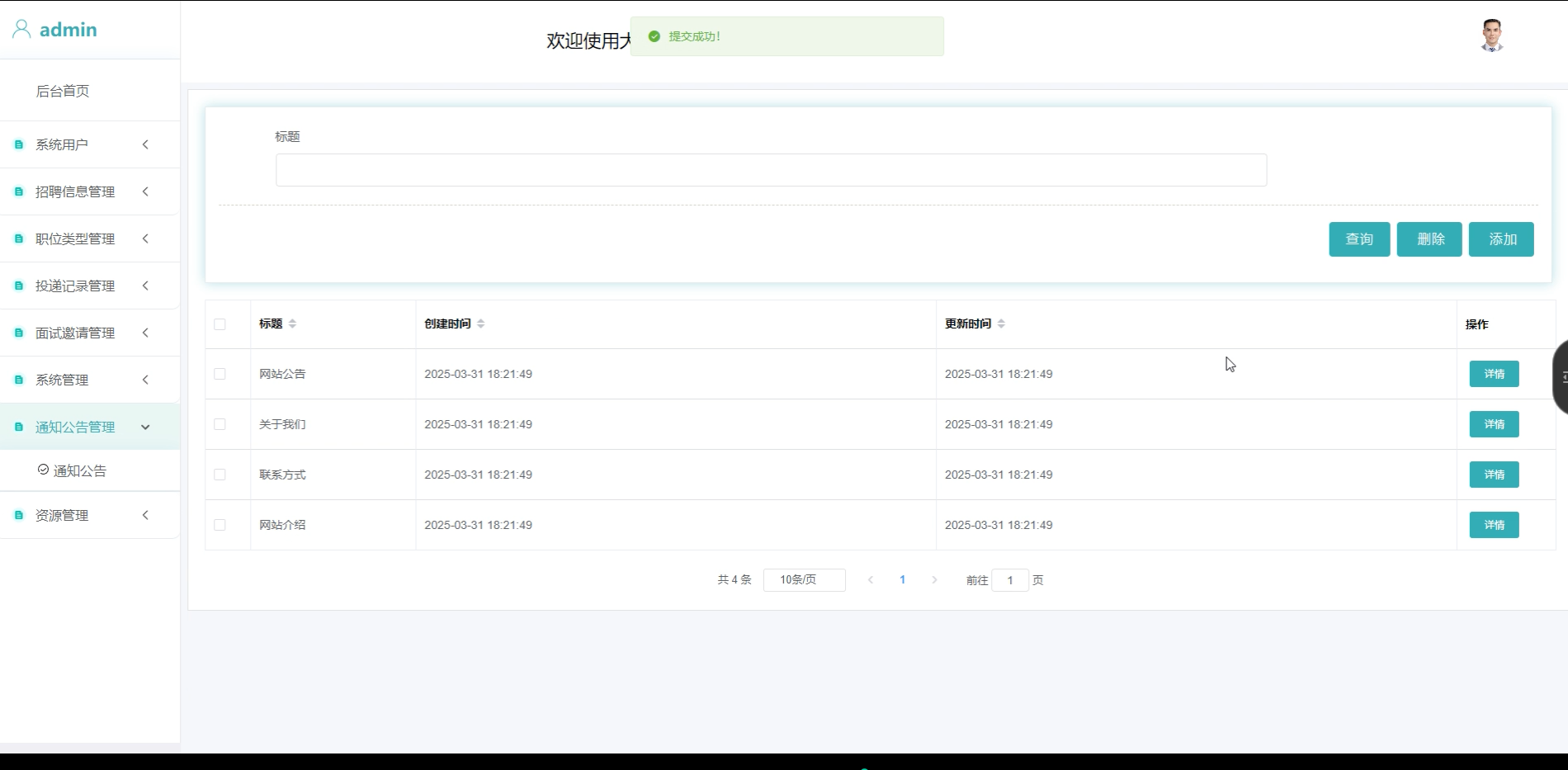 通知公告:获取系统发布的各类通知,如招聘会信息、系统维护公告等。