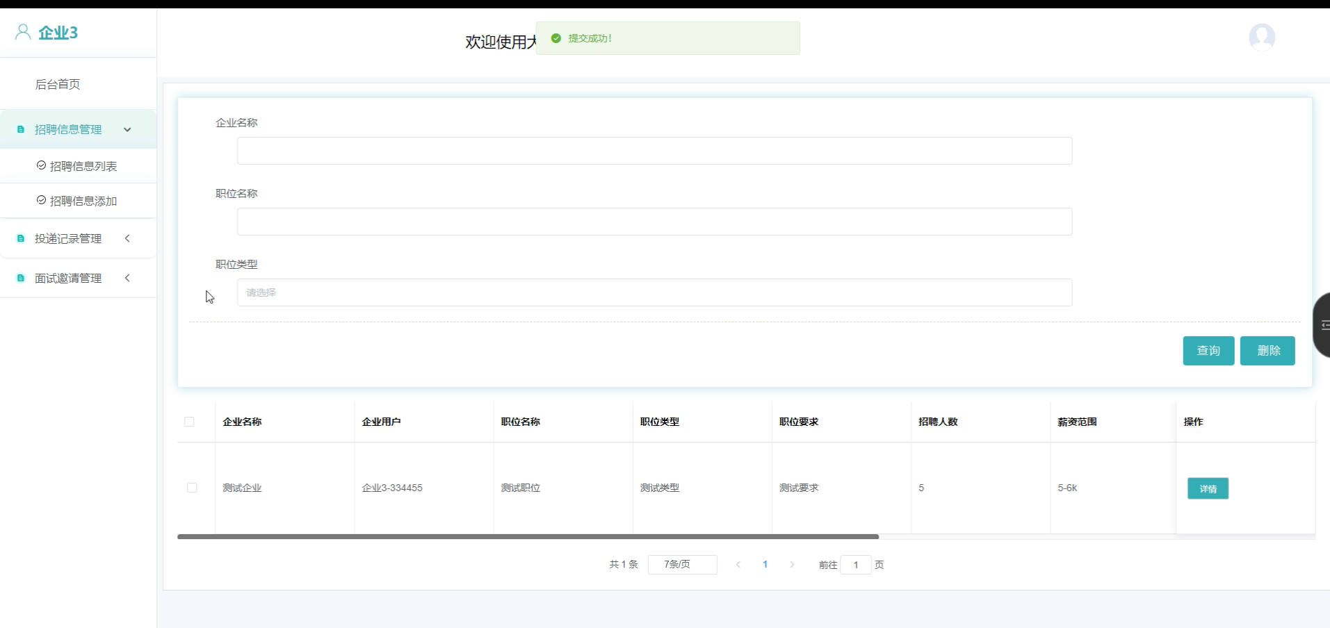 | 招聘信息添加成功 | 结果输出符合预期 | 通过 |