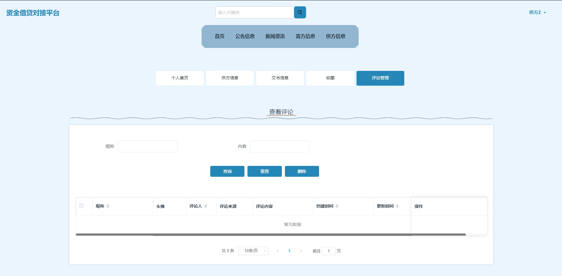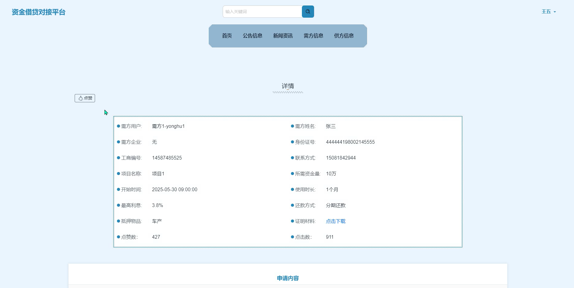 需求方可发布与管理自身资金需求内容,供方则通过该模块浏览借款意向、筛选对接对象并进一步联系,促成双方合作。