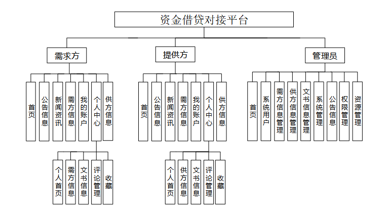本资金借贷对接平台设计分三个主要用户角色:需求方用户和管理员及提供方用户。以下是对每个角色的功能需求的详细描述。