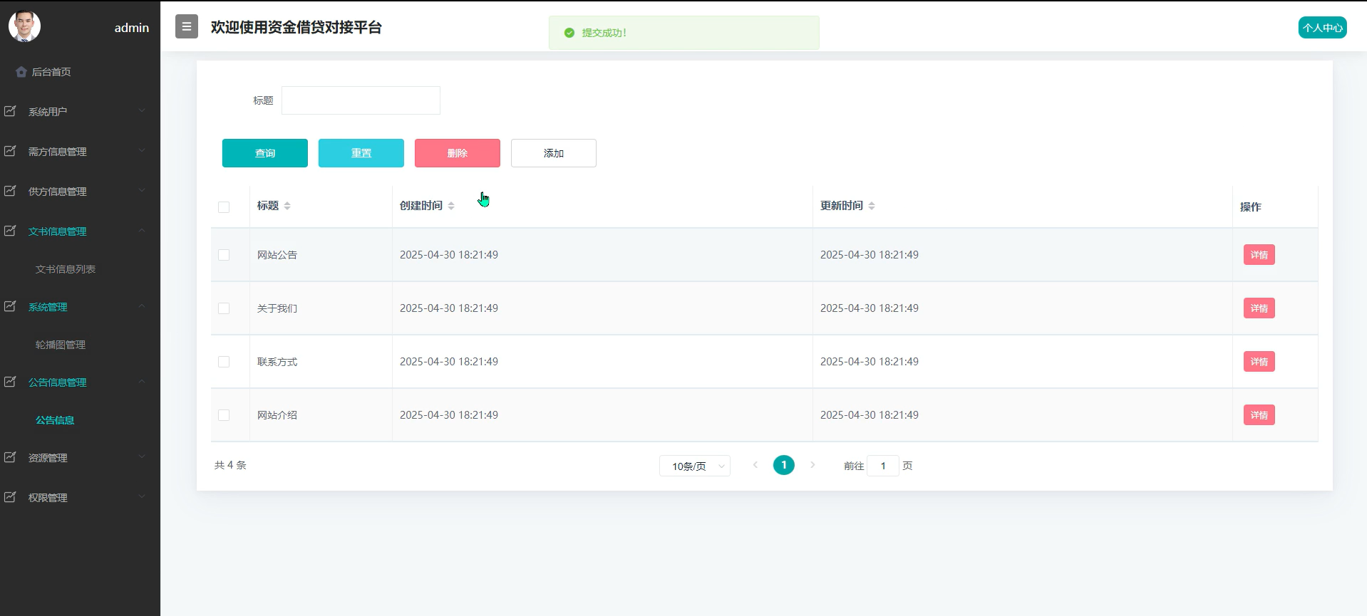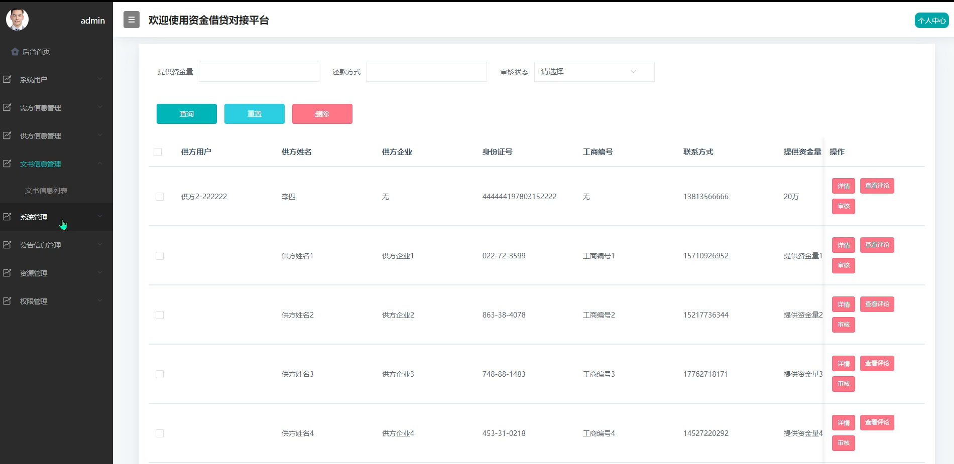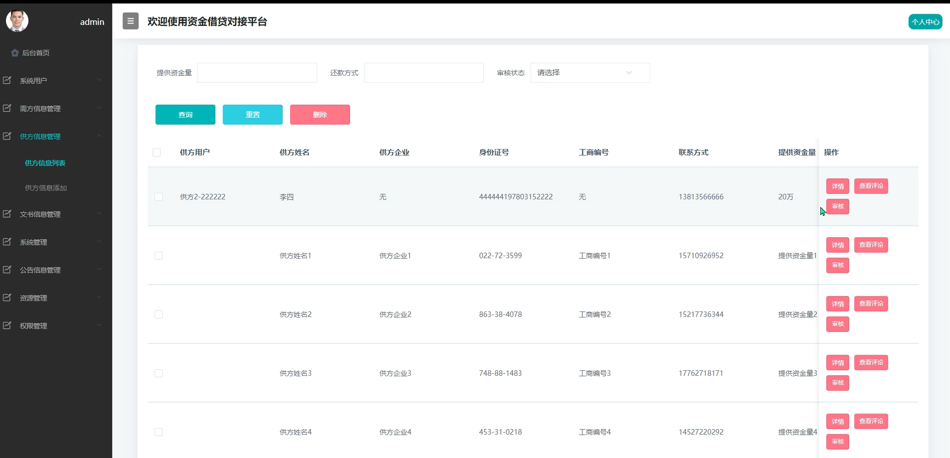 对资金提供方发布的信息进行集中管理,包含审核、下架与编辑功能,确保出借方资质与发布内容符合平台标准,提升用户信任度。