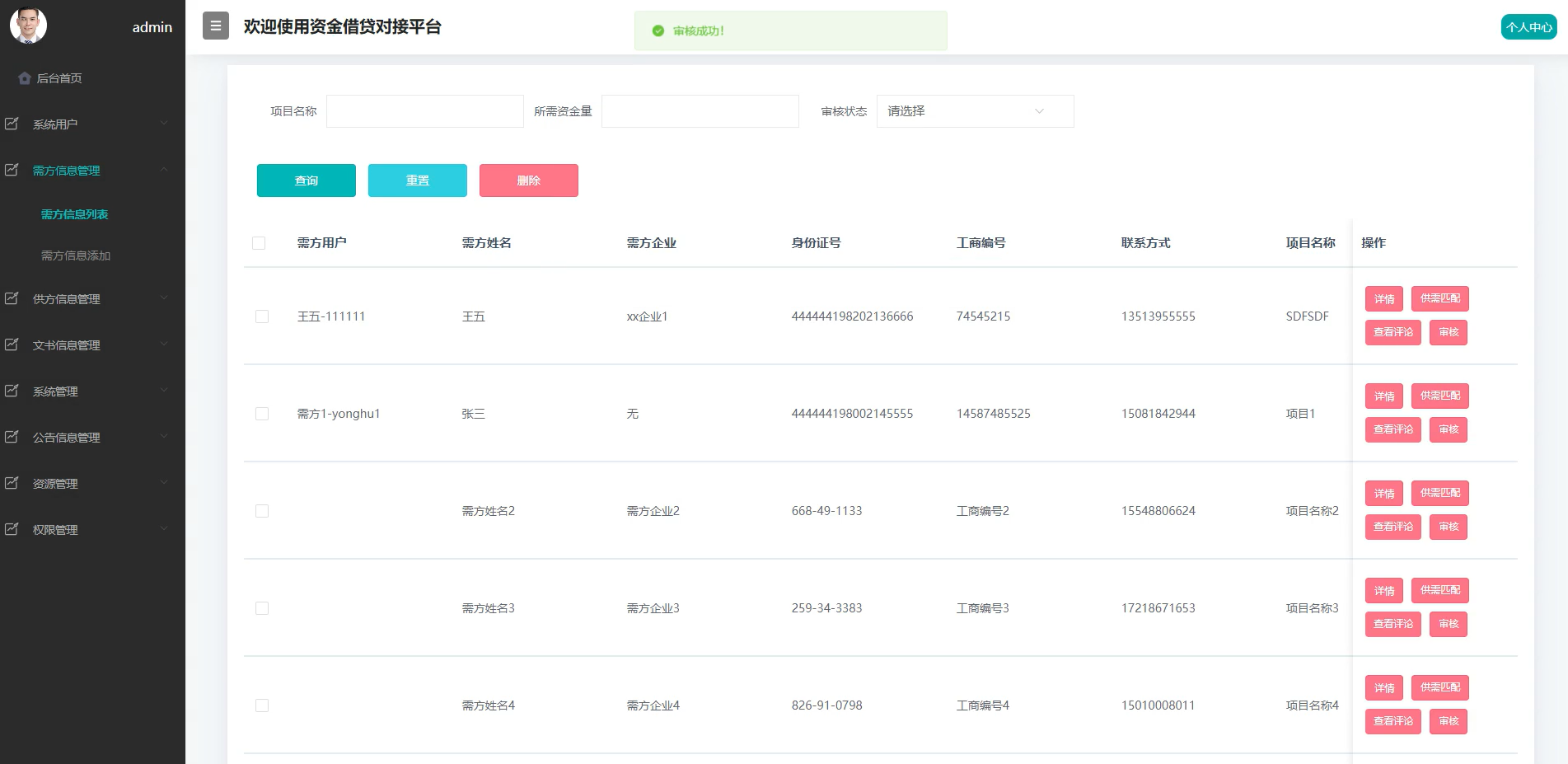用于审核、修改、删除需求方发布的借贷需求信息,保证信息的真实性、完整性与合规性,防止虚假需求扰乱平台秩序。