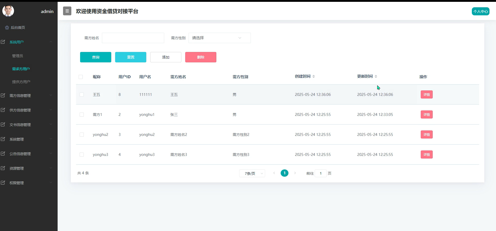 2. 系统用户管理(管理员、需求方用户、提供方用户)