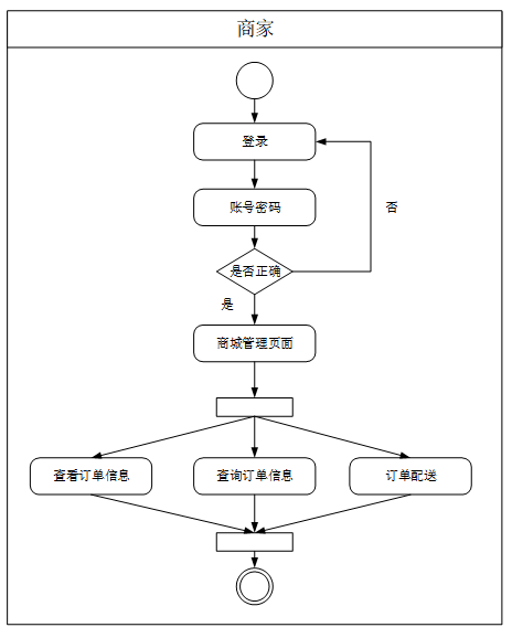 所有的业务流程(用户、商家、管理员)都必须在进入登录系统以后,输入账号密码,系统后端收到信息之后开始验证,验证通过则登录成功,可进行相关的业务查询;若验证失败,就需要再次输入账号密码,直到登录成功方可查询相关业务。