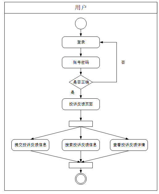 用户成功登录后,就能进入投诉反馈页面,这时系统前端会显示投诉反馈页面,并提供诸如提交、搜索、查看投诉反馈信息等选项,当用户处在投诉反馈页面时,可以选择提交新的投诉反馈信息,这样系统前端就会把用户所投的信息传给系统后端,而后端会把这些信息存入数据库。 用户也可以选择搜索投诉反馈信息,系统前端会把用户的搜索请求发送给系统后端,后端会在数据库中搜索相关信息,然后回传给前端显示给用户看,用户也可以选择查看投诉反馈的详细情况,系统前端会把用户的查阅请求传递给系统后端,后端从数据库获取详细投诉信息后再传回前端显示。用户投诉反馈活动图如图3-5所示。
