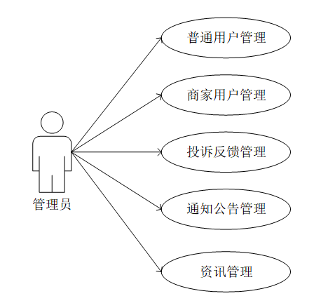 管理员通过登录功能步入到后台管理系统当中,普通用户管理功能可让管理员查看,更改以及删除普通用户的账户信息,商家用户管理功能可以让管理员能够对商家账户执行管理操作,从而保证商家信息的准确性,投诉反馈管理功能准许管理员查看用户所提交的投诉信息并予以处理,通知公告管理功能支持管理员发表,更改以及删除平台的通知与公告,资讯管理功能许可管理员管理商城的资讯内容。管理员功能用例图如图3-15所示。