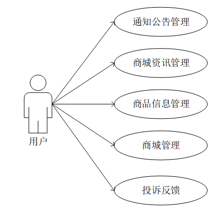 系统提供投诉反馈、通知公告、商城资讯、商品信息以及商城管理功能。用户可以通过投诉反馈功能对商品或者服务中出现的问题或者建议进行投诉。通知公告功能可以让用户看到商城发布的通知和公告。商城资讯功能可以显示商城最新的商品信息以及最新的行业动态。商品信息功能可以让用户看到商品的详细信息。商城管理功能可以让用户查看自己的购物车以及订单信息。用户功能用例图如图3-13所示。