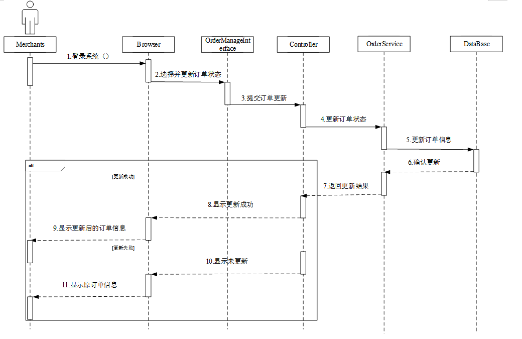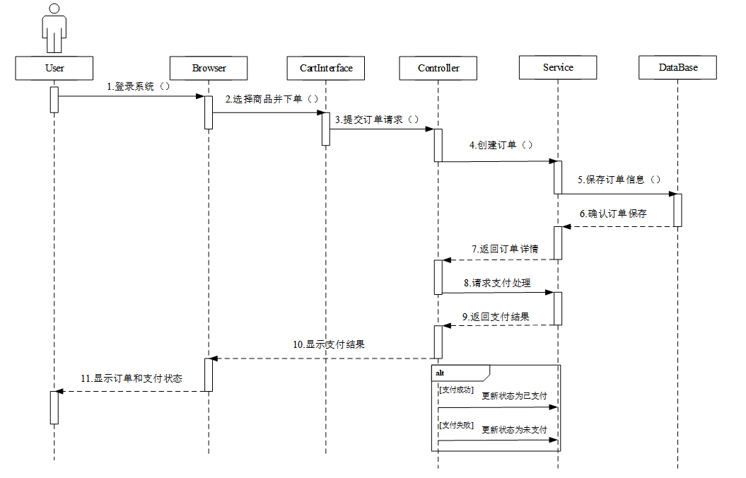 顺序图是一种展现对象间交互动态的图表,按照时间顺序详细描述了对象间的通讯过程。鉴于篇幅,本文将重点阐述用户购买商品、投诉反馈和管理员管理订单三个用例的顺序图。