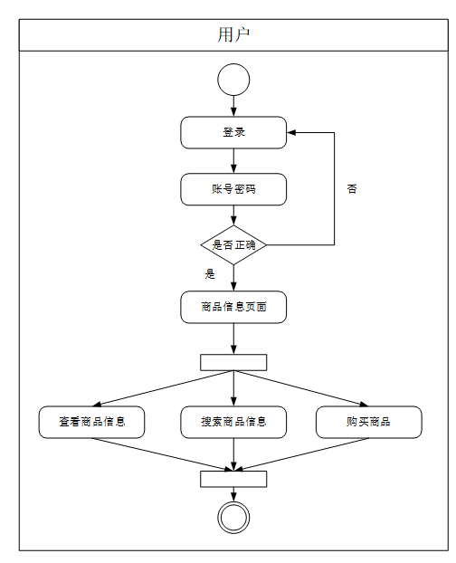 用户登录成功之后,能浏览商品信息页面,系统前端显示商品信息,而且从数据库当中查询商品信息,用户可以查看商品信息,搜索商品或者购买商品,若用户选取查看商品信息,系统前端就会表现商品的详细信息,若用户搜索商品,系统前端依照用户所键入的关键词执行搜索,然后表现搜索结果,若用户选取购买商品,系统前端会引领用户步入购买流程。用户在完成查看、 搜索或者购买商品之后,可以选择浏览其他的商品信息,也可以选择退出该系统,用户完成了一次完整的浏览商品信息的活动。用户浏览商品活动图如图3-3所示。
