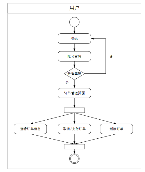 用户登录成功之后,就可以进入到订单管理页面,这时系统前端就会显示出订单列表,从数据库中查询出订单信息,用户可以点击自己感兴趣的订单,就可以查看订单信息详情,当用户查看完订单信息详情之后,就可以进行以下操作:查看订单信息、取消/支付订单、删除订单。 如果用户选择查阅订单信息,那么系统前端就会显示订单的所有信息;如果用户选择取消/支付订单,系统前端就会把用户的支付或取消命令发给系统后端,后端执行这个请求,还要更新数据库;如果用户想删掉订单,系统前端就会把用户的删除命令发给系统后端,后端就会把订单信息从数据库中删除。用户管理订单活动图如图3-4所示。