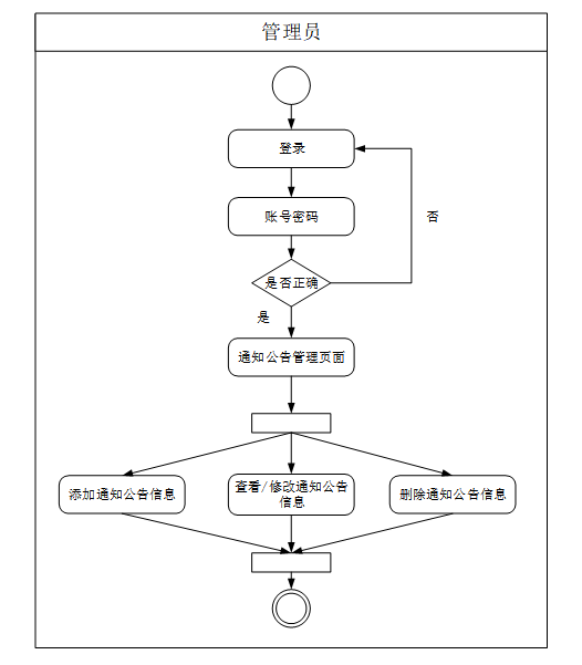 管理员登录成功以后,就能对通知公告信息展开管理,系统前端显示通知公告管理页面,并且从数据库查询通知公告信息,管理员可以选取增添新的公告信息,查阅或者更改现有的公告信息,也可以删掉公告信息。管理员对公告信息实施管理以后,可以决定保存所作的改变,如果管理员选定了保存改变,那么系统前端就会把改变递交到系统后端,后端就会把改变过的消息存入数据库之中,倘若管理员未选定保存改变,系统前端就会返回到通知公告管理页面,管理员就能够接着去管理别的公告信息。管理员管理通知公告信息的活动图如图3-11所示。