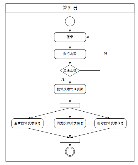 管理员登录成功后,可以对投诉反馈信息进行管理,系统前端显示出投诉反馈管理页面,系统从数据库中查询投诉反馈信息,管理员可以选取查阅投诉反馈信息、回应投诉反馈信息及删除投诉反馈信息。 管理员对投诉反馈信息进行处理,管理员处理完投诉反馈信息之后可以保存更改,如果管理员保存了更改,系统前端就会把更改发送给系统后端,后端会把更新过的投诉反馈信息保存到数据库里,如果管理员没有保存更改,系统前端就会返回到投诉反馈管理页面,这样管理员就可以去处理其他的投诉反馈信息。管理员处理投诉反馈信息的活动图如图3-10所示。