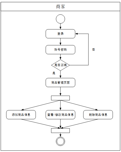 商家登录成功,便能对商品信息执行管理,此时系统前端就会显示出商品管理页面,而且从数据库中查询商品信息,商家可以自行选择是否增添新的商品信息,也可浏览并修改已有的商品信息,还可以删除不必要的商品信息。 商家对商品信息实施管理以后,可以选择保留修改,如果商家选择保留修改,系统前端就会把修改提交给系统后端,系统后端会把更新过的信息存进数据库,如果商家不选择保留修改,系统前端就会回到商品管理页面,商家可以继续管理其他商品信息。商家管理商品信息的活动图如图3-7所示。