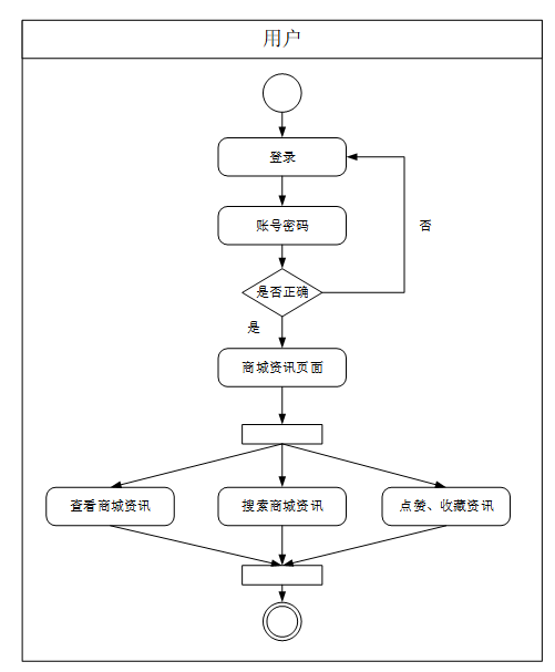 用户登录成功后,就可以浏览商城资讯,此时系统前端会显示商城资讯,同时也会对数据库进行查询,获取相关的资讯信息,用户可以选择查看商城资讯、搜寻商城资讯、点赞、收藏资讯,如果用户选择查看商城资讯,系统前端就会从数据库中获取相应的资讯信息并进行展示;如果用户选择搜寻商城资讯,系统前端就会根据用户所写的关键词进行搜索,并将搜索到的结果进行展示;如果用户选择点赞或收藏资讯,系统前端就会将用户的点赞或收藏操作提交给系统后端,系统后端将这些信息存入数据库,这样用户就可以结束浏览商城资讯的过程。用户浏览商城资讯活动图如图3-2所示。
