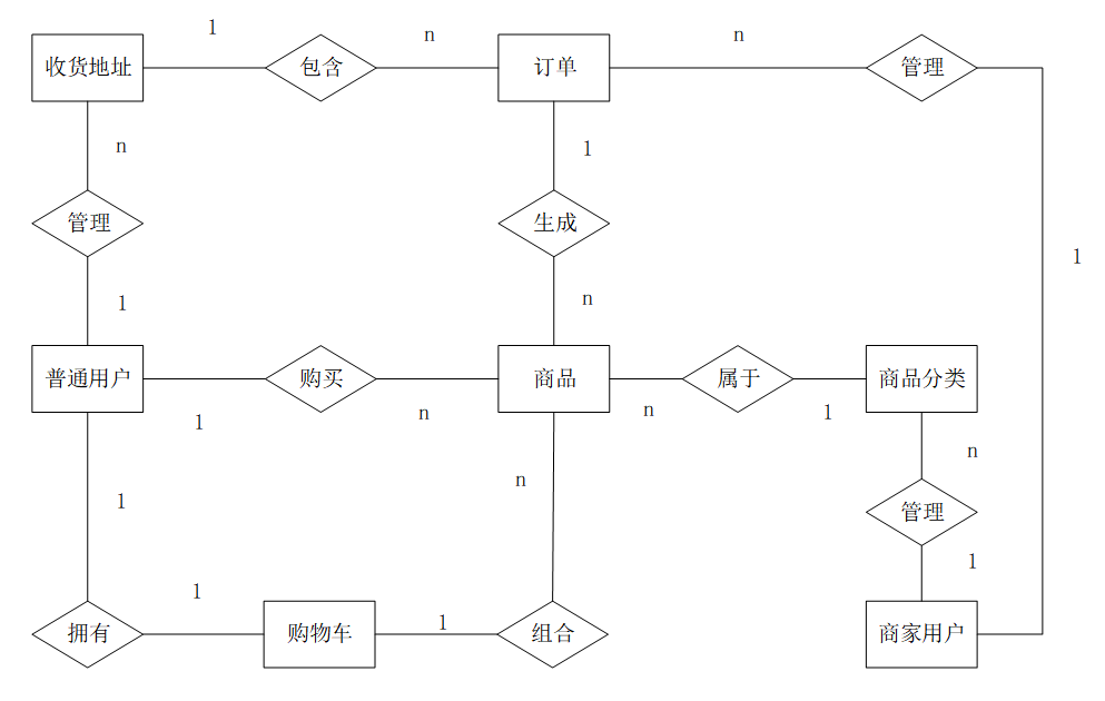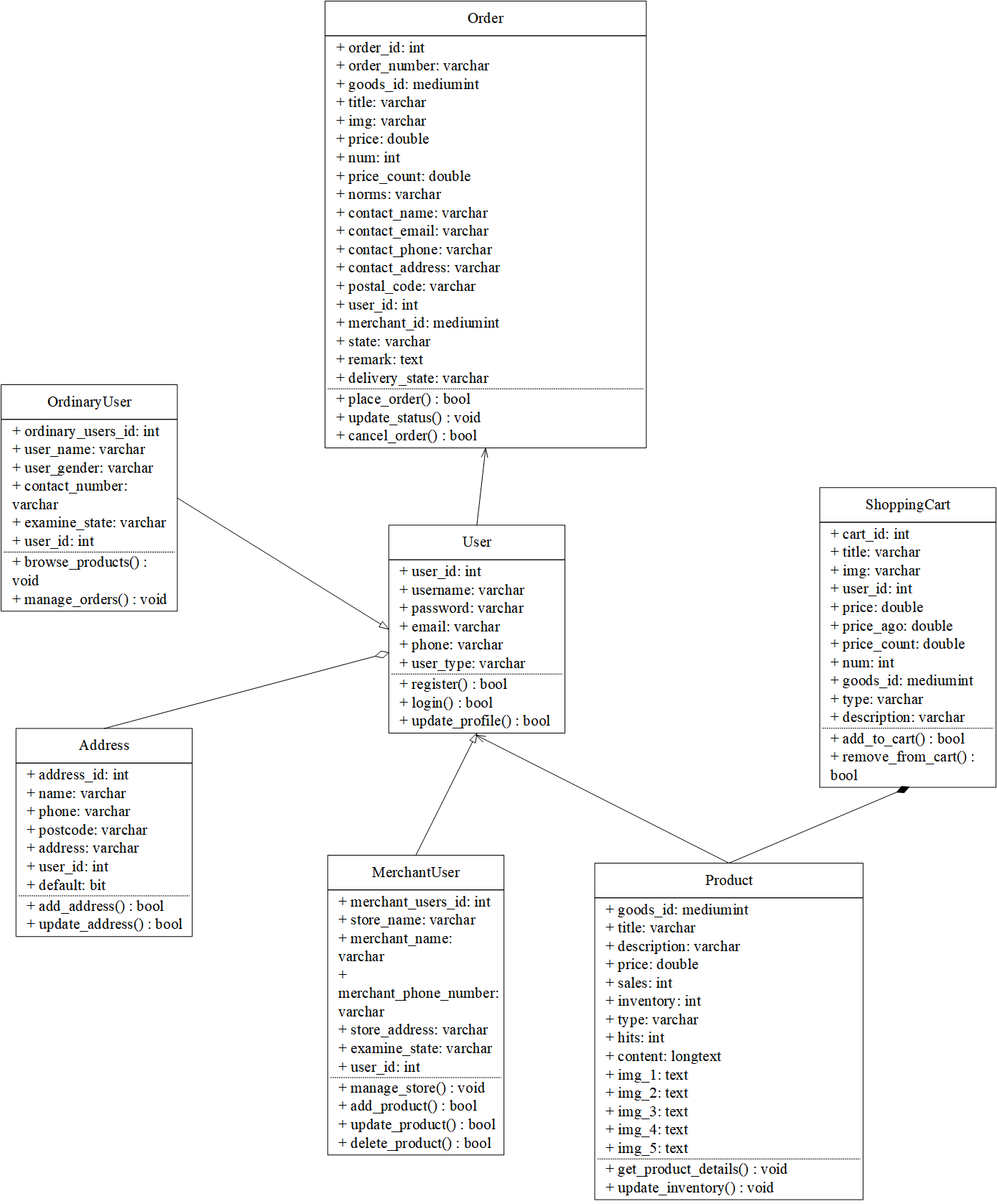 由前面的系统分析可知,断桥镇水果交易网站中有七个主要的类对象:“用户”类,“商品分类”类,“地址”类,“购物车”类,“商品”类,“订单”类以及“商家用户”类,其中用户类同地址类,购物车类,商品类,订单类之间存在关联关系,商家用户类和商品类,订单类存在关联关系,购物车类与商品类存在关联关系,订单类又与地址类存在关联关系。创建好的完整类图如图4-2所示。