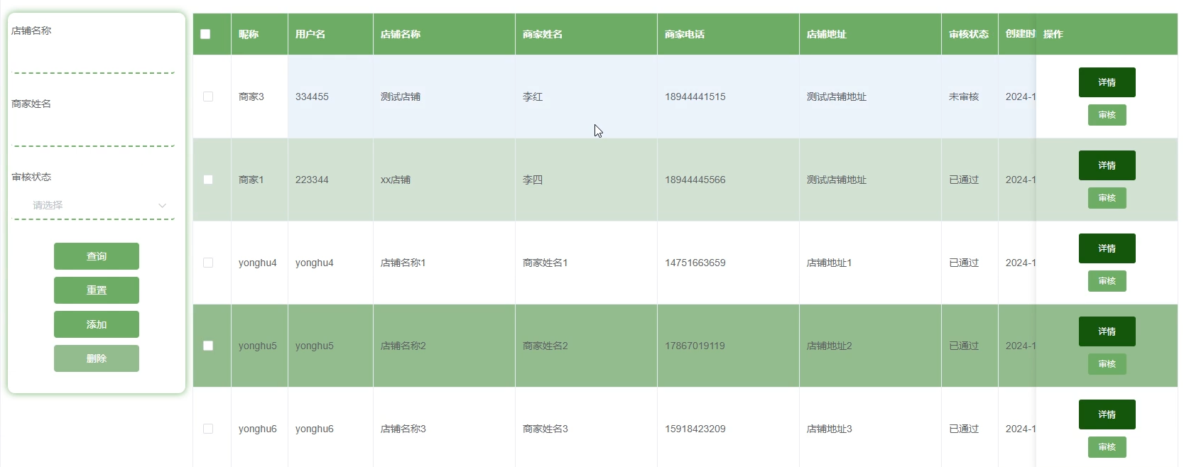 管理员于后台运作系统内点选“商家管理”,便会步入商家目录页,在此,管理员可查阅各个商家的信息,并对商家资质展开审核,点选“通过”或者“否决”按键即可执行审核操作。商家用户管理功能效果图如图5-9所示。