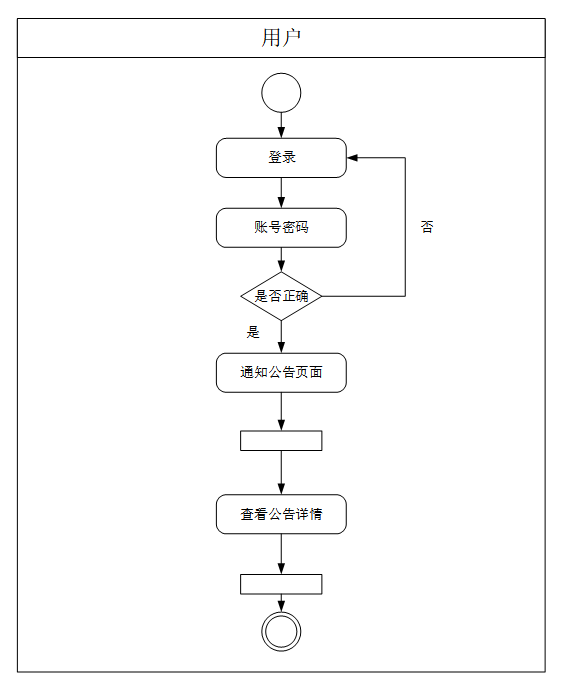 用户登录成功以后,可浏览通知公告页面,系统前端显示公告列表,并且向数据库查询公告信息,用户选取感兴趣的公告,进而查看公告的详细信息,用户查看完公告的详细信息以后,便可自行选择是否执行操作,倘若用户想要执行操作,系统前端就会把用户的请求发送给系统后端,系统后端再对这些请求信息加以处理,如果用户没有要执行的操作,系统前端就会返回公告列表,用户就可以继续浏览其他公告信息,直至结束整个查阅公告信息的过程。用户查看公告活动图如图3-1所示。