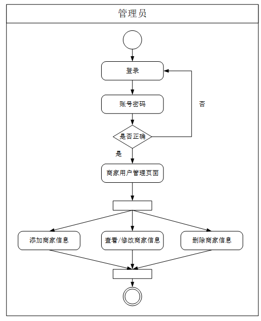 管理员登录成功以后,就能够管理商家信息,这时系统前端会显示商家管理页面,并且从数据库中调取商家信息,管理员可以选取增加新的商家信息,查看或者更改已有的商家信息,也可以删除商家信息。管理员对商家信息实施管理之后,可以选择是否保存所做出的修改,倘若管理员选择保存修改,那么系统前端就会把所做的修改传递给系统后端,后端会把修改过的商家信息存入数据库,如果管理员没选保存修改,系统前端就会再次显示商家管理页面,管理员就能接着去管理其他商家的信息。管理员管理商家信息的活动图如图3-9所示。