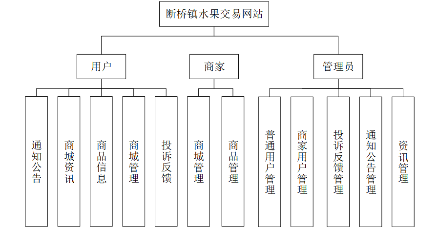 根据系统分析,断桥镇水果交易网站后台管理端设计为登录、商品管理、投诉反馈管理、通知公告管理、资讯管理等,其中管理员可以对系统的所有模块进行管理。商家端设计的功能模块有商城管理、商品管理等。用户端设计的功能模块有投诉反馈、通知公告、商城资讯、商品信息等。整个系统的功能模块设计如图4-1所示。