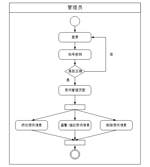 管理员成功登录系统之后,就可以对资讯信息实施管理,这时系统前端就会显示出资讯管理页面,而且还要从数据库中去查找资讯信息,管理员可以自己挑选增添新的资讯信息,也可以浏览或者修改已有的资讯信息,还可以删除资讯信息。 管理员对资讯信息执行管理操作之后,可选择是否保留修改,倘若管理员决定保留修改,那么系统前端就把修改交予系统后端,而后端就会把更新过的资讯信息存储到数据库当中,倘若管理员不保留修改,系统前端就会返回到资讯管理页面,此时管理员可继续去管理其他资讯信息。管理员管理资讯信息的活动图如图3-12所示。