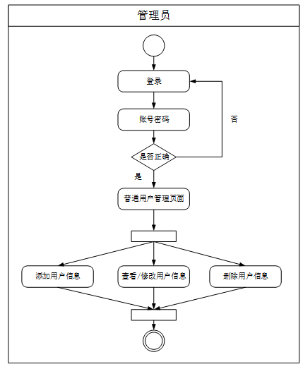 管理员登录成功之后,就能够执行用户信息管理,系统前端表现用户管理页面,并且从数据库中查询用户信息,管理员可以选择增添新的用户信息,查阅或者更改已有的用户信息,也可以删掉用户信息。 管理员对用户信息实施管理,若管理员决定保存修改,那么系统前端就会把修改发送到系统后端,而后端会把更新过的信息存进数据库当中,倘若管理员未选保存修改,系统前端便回到用户管理页面,管理员就能接着去管理其他用户的资料。管理员管理用户信息的活动图如图3-8所示。