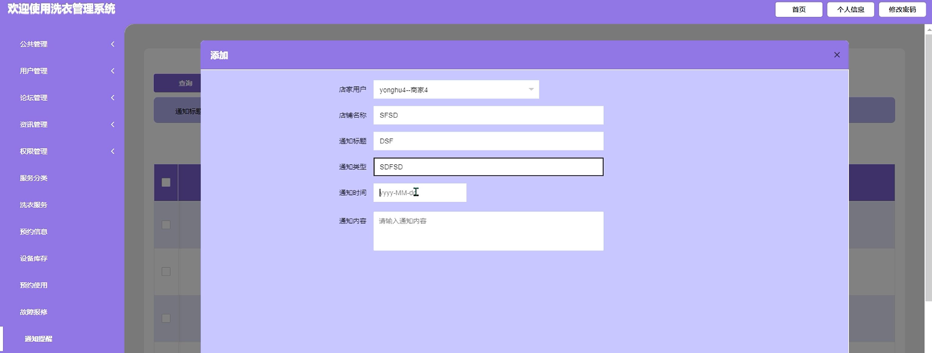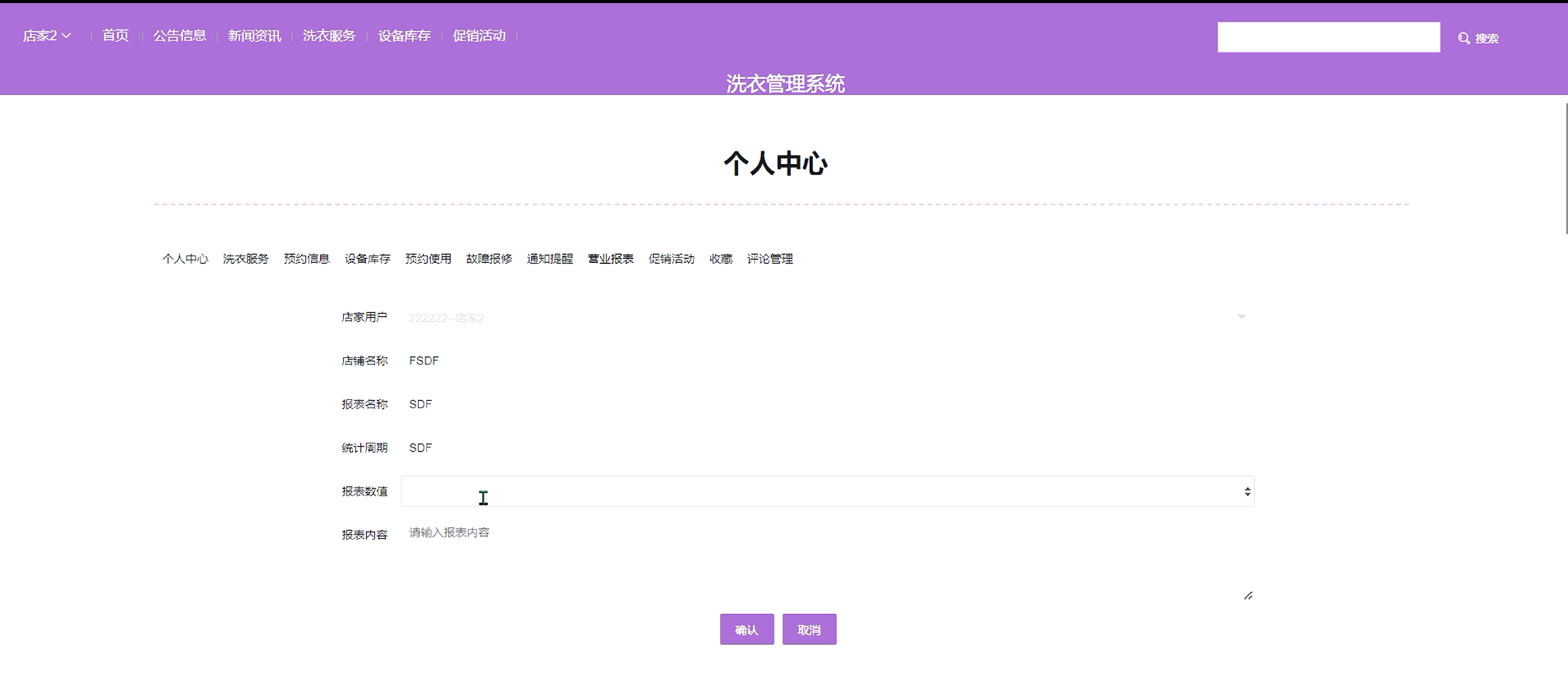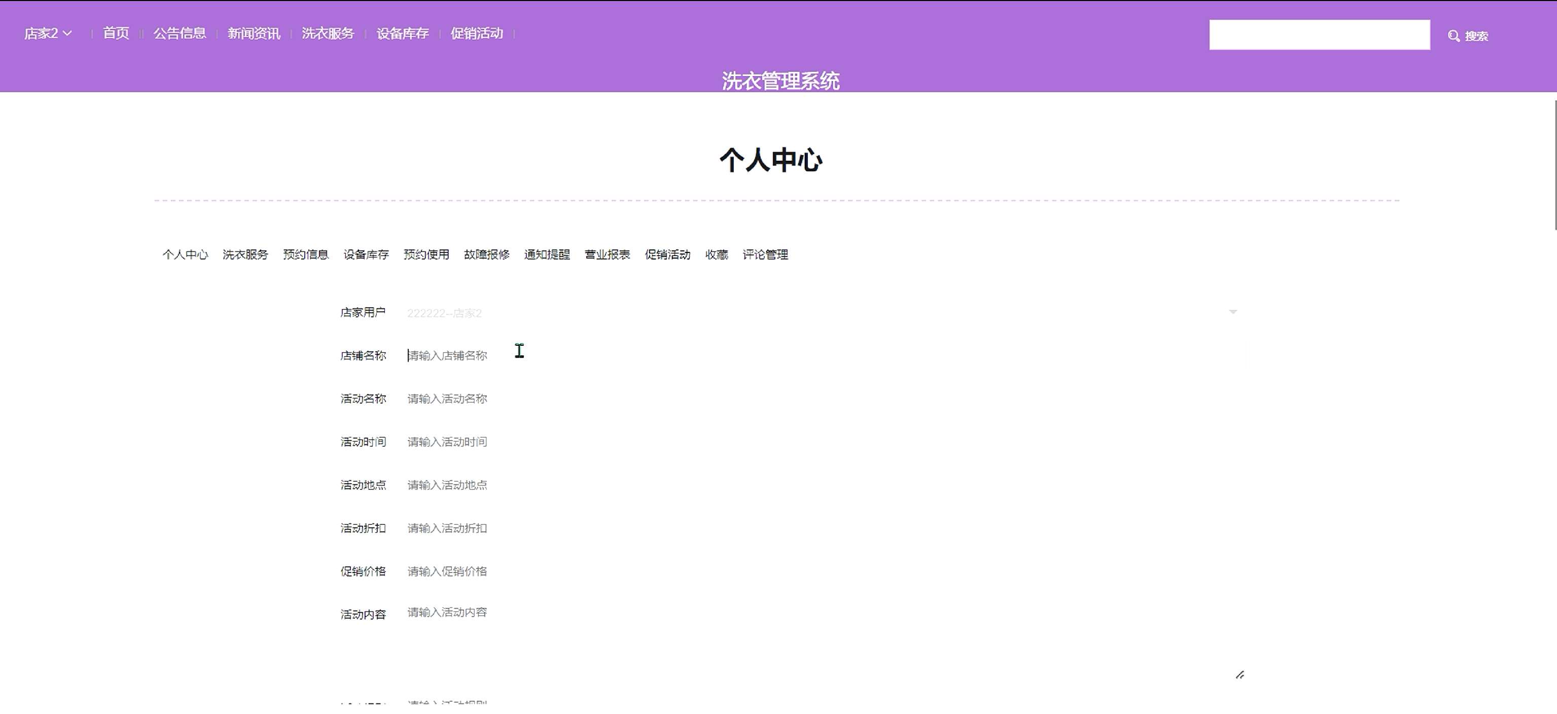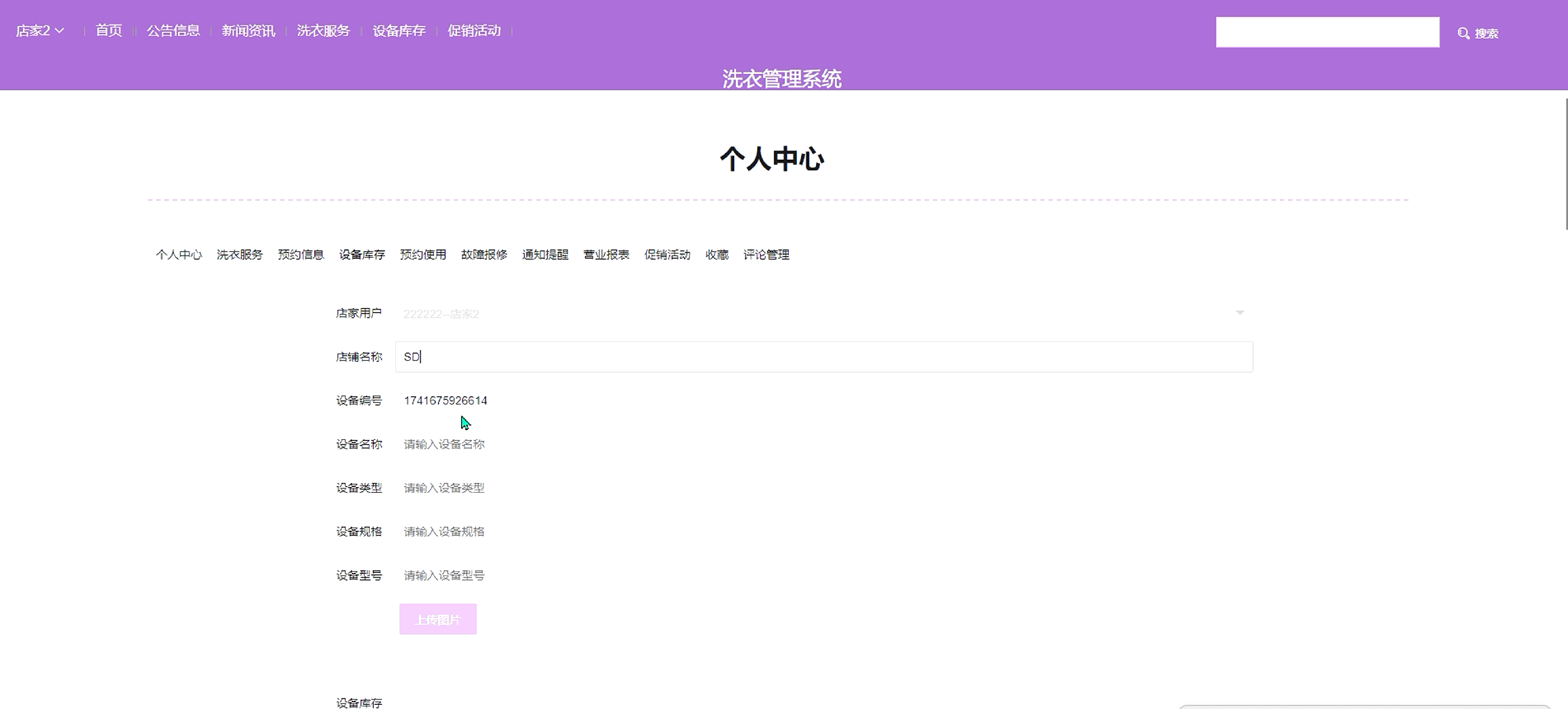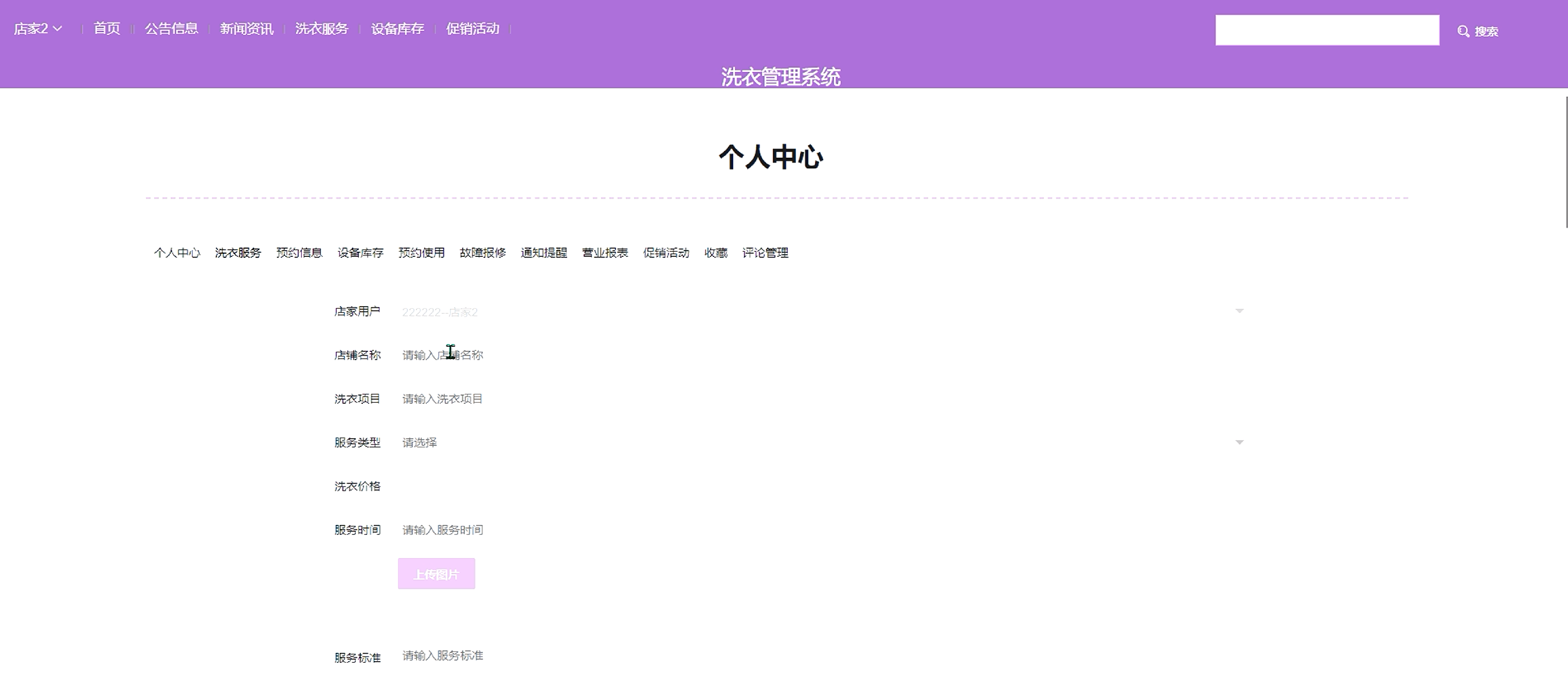 (10)个人中心:个人中心包含多个功能模块,如个人首页、洗衣服务、预约信息、设备库存、预约使用、故障报修、通知提醒、营业报表、促销活动、收藏、评论管理。点击进入“洗衣服务”可新增新的服务信息,包括店铺名称、洗衣项目、服务类型、洗衣价格、服务时间、服务标准、服务内容和服务详情。点击进入“设备库存”可新增设备信息,包括店铺名称、设备编号、设备名称、设备类型、设备规格、设备型号、设备库存、收费价格、使用状态、设备介绍和设备详情;再次页面还可新增故障报修信息。点击进入“营业报表”可新增报表信息,包括店铺名称、报表名称、统计周期、报表数值和报报表内容。点击进入“促销活动”可新增活动信息,包括店铺名称、活动名称、活动时间、活动地点、活动折扣、促销价格、活动内容和活动规则。