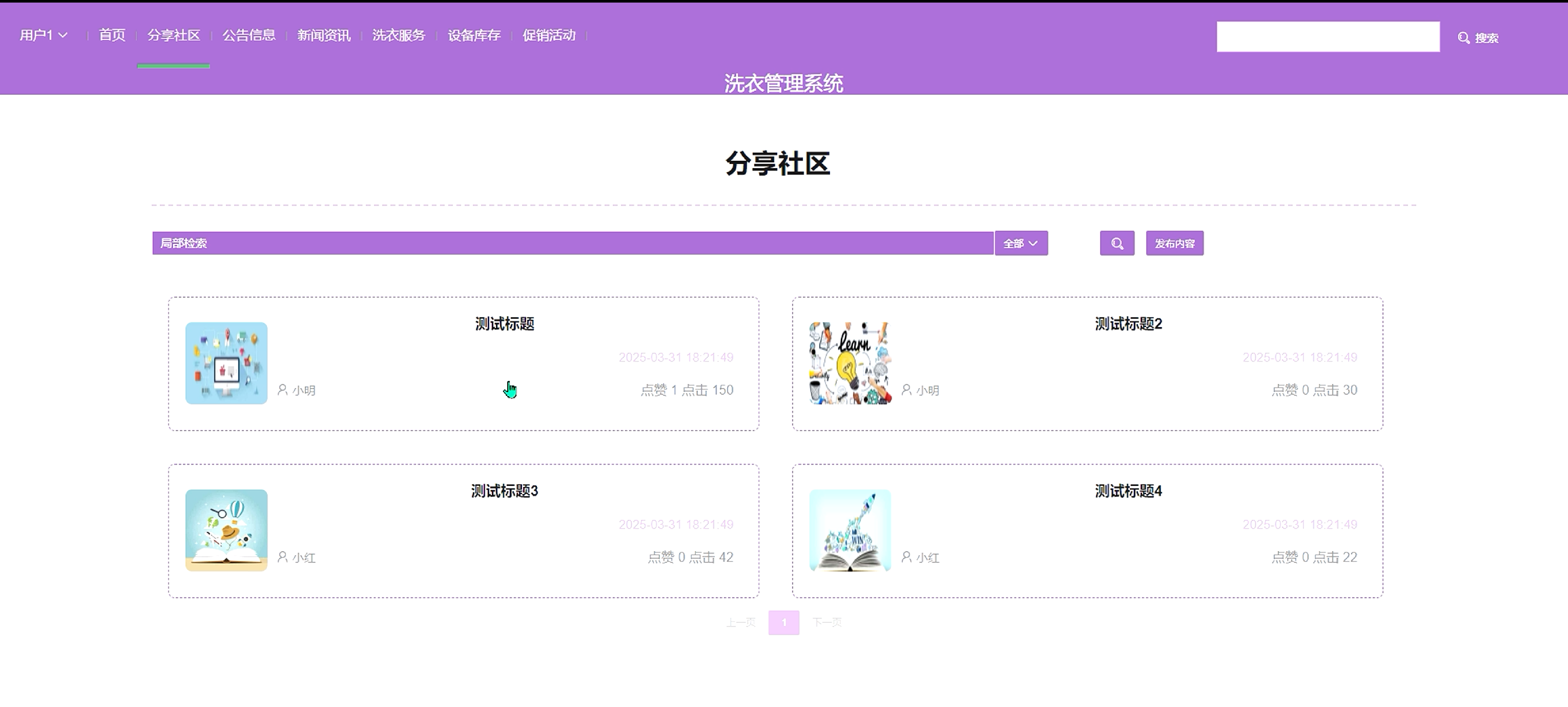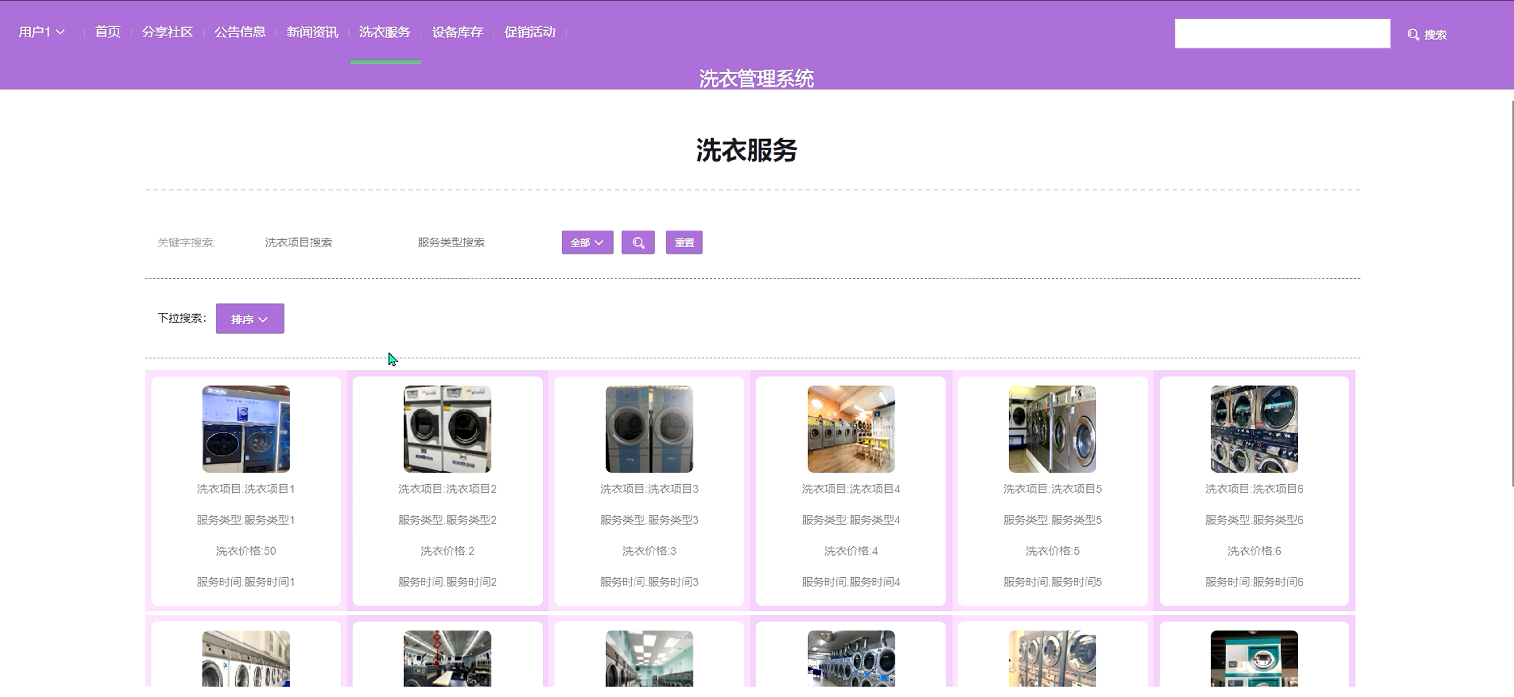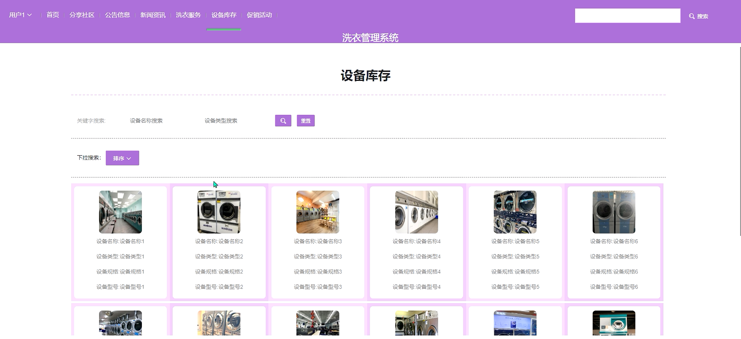 (2)首页:用户进入洗衣管理系统的时候,首先映入眼帘的是系统的首页、分享社区、公告信息、新闻资讯、洗衣服务、设备库存、促销活动等信息。