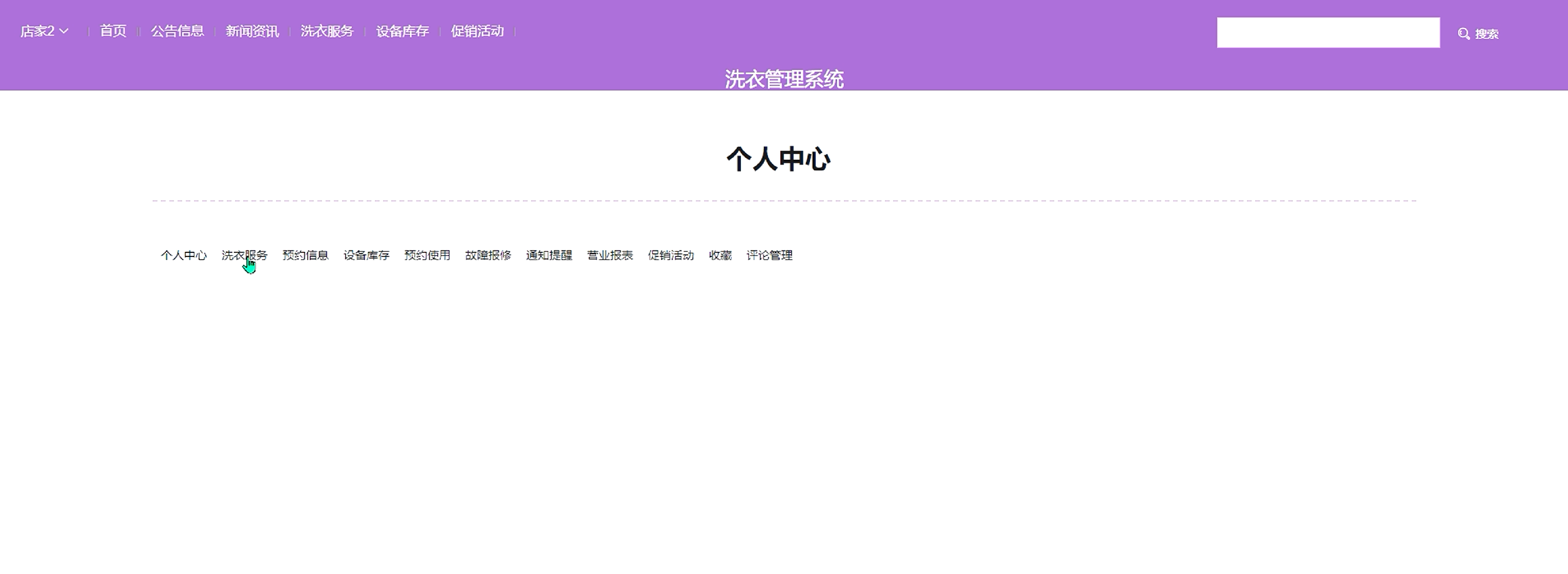个人中心:个人中心包含多个功能模块,如个人首页、洗衣服务、预约信息、设备库存、预约使用、故障报修、通知提醒、营业报表、促销活动、收藏、评论管理。界面图如下。