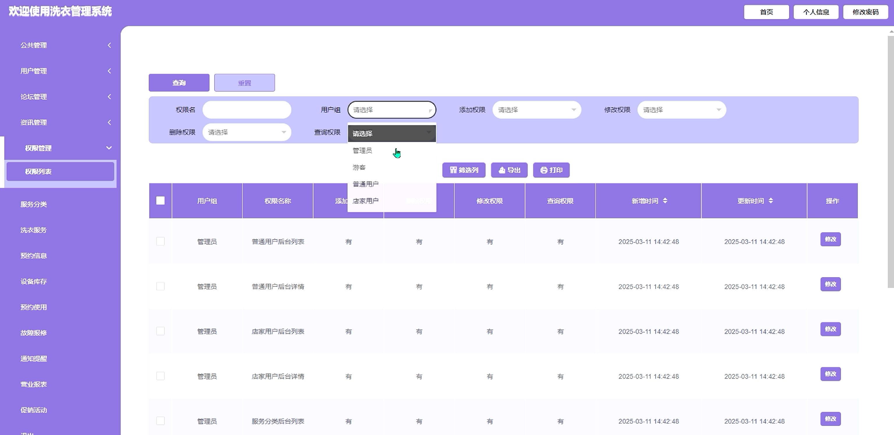 权限管理:管理员可以对不同用户角色进行权限设置,控制不同用户的操作权限和访问范围。界面如下图所示。