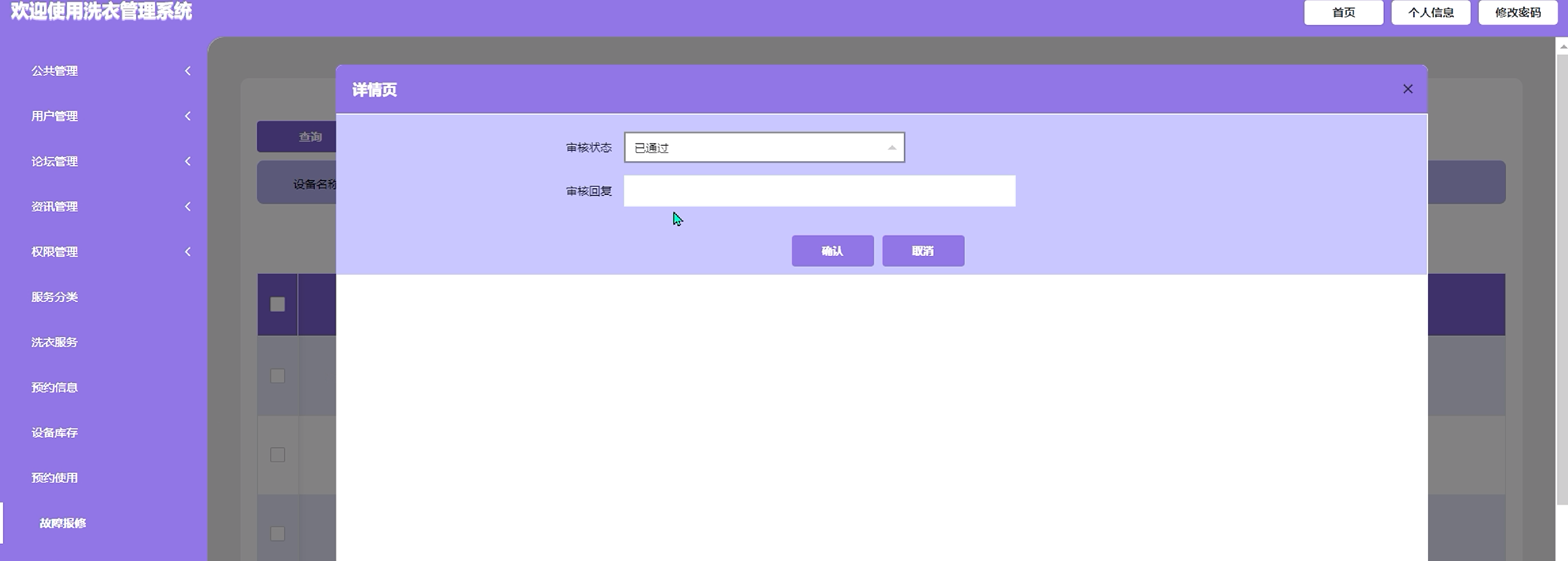(12)故障报修:管理员点击可查看故障报修列表,可对故障报修申请进行审核回复。
