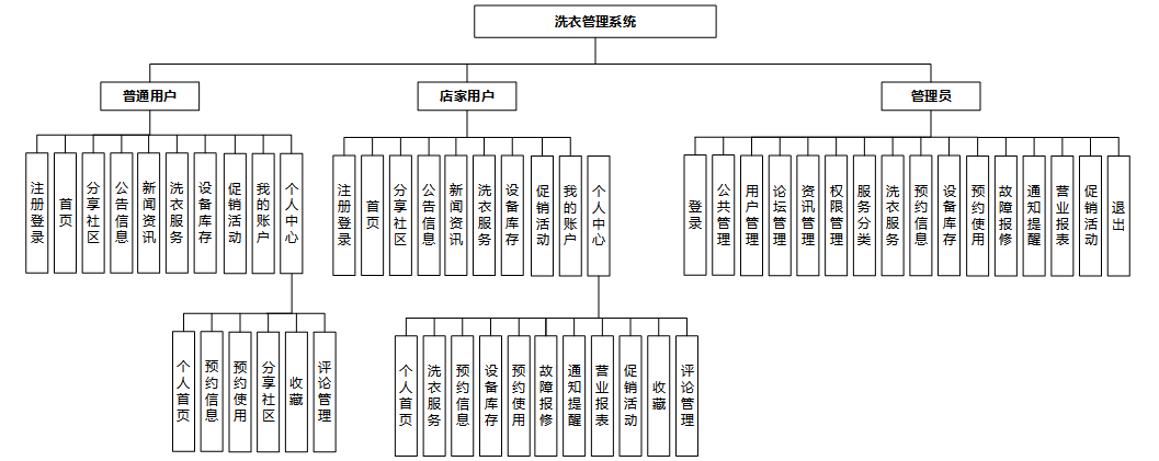 洗衣管理系统分为三大部分:管理员、普通用户和店家用户。