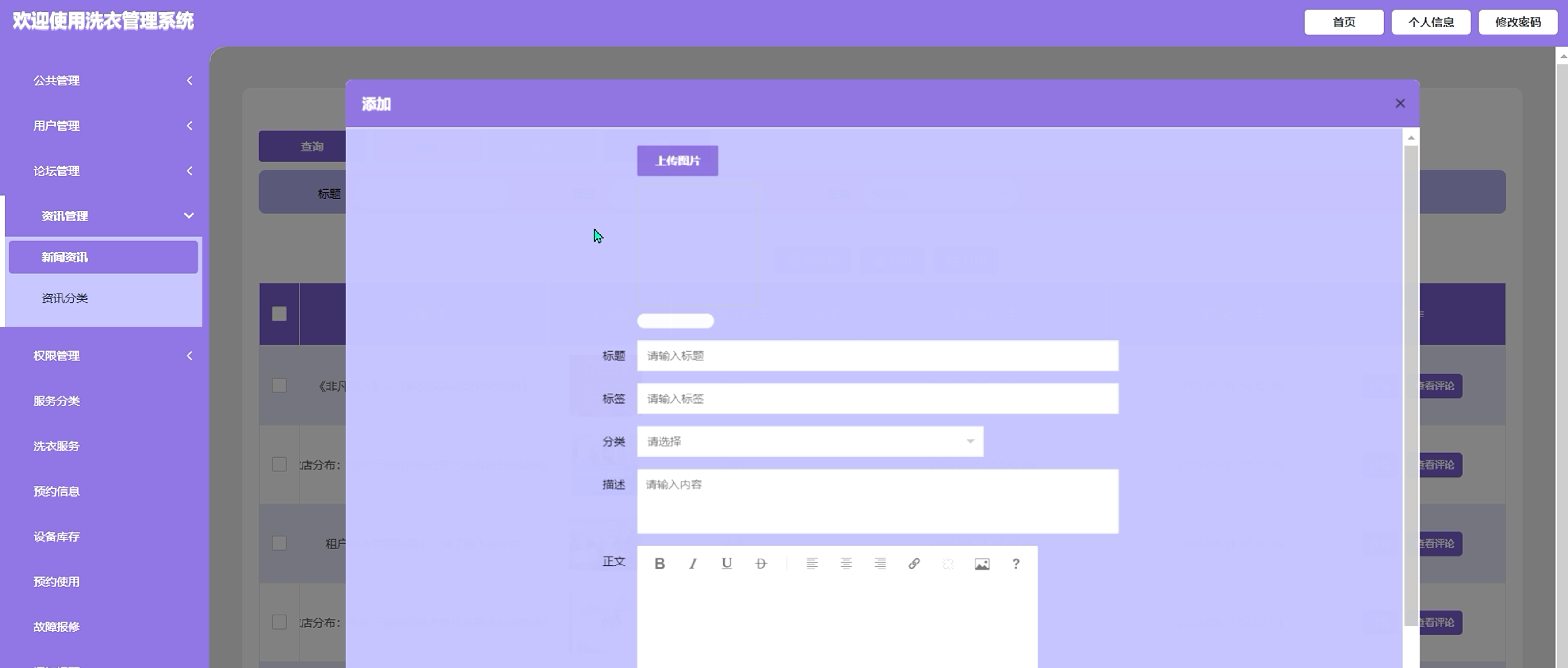 (5)资讯管理:管理员点击可查看新闻资讯和资讯分类;如需添加新的资讯,点击“新增”按钮,上传封面图,输入标题,选择分类,输入标签、描述和正文,点击“确认”按钮进行添加。同时可对资讯和分类进行增删改查。