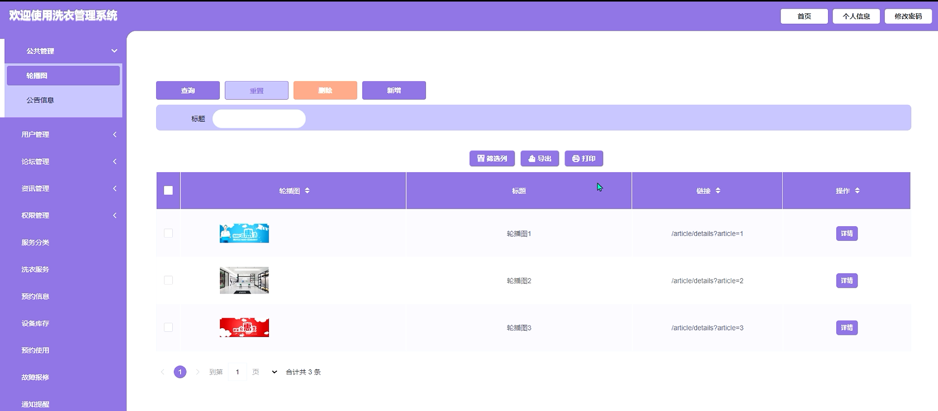 (2)公共管理:公共管理包含轮播图和公告信息。如需添加新的轮播图,点击右侧“新增”按钮,上传图片,输入标题和链接,点击“确认”按钮进行添加;如需添加新的公告信息,点击右侧“添加”按钮,输入标题和正文,点击“确认”按钮进行添加。同时可对轮播图和公告信息进行增删改查。