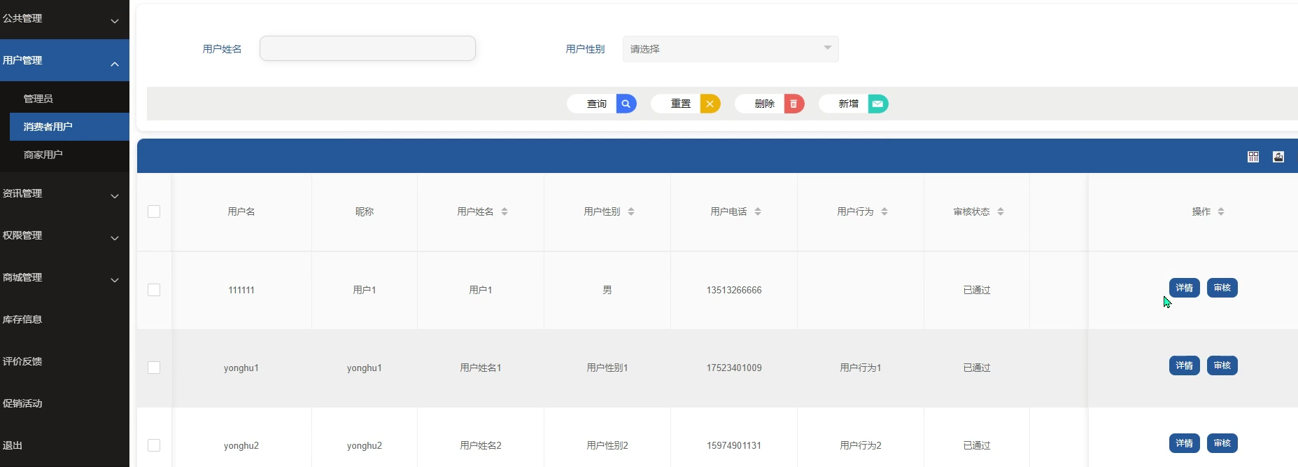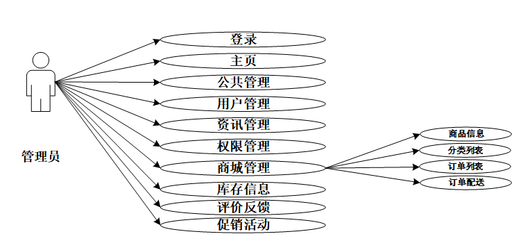 管理员可管理主页、公共管理、用户管理、资讯管理(行业资讯、资讯分类)、权限管理、商城管理(商品信息、分类列表、订单列表、订单配送)、库存信息、评价反馈、促销活动等。