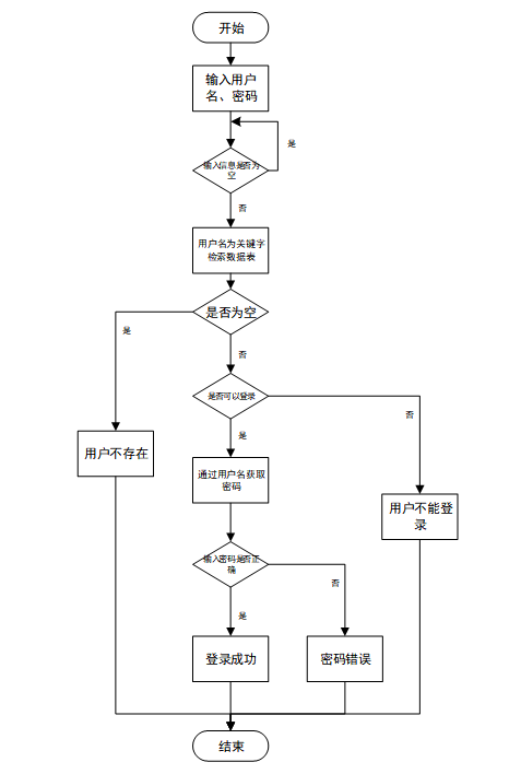 用户输入用户名和密码后,系统先检查输入是否为空,再验证用户名是否存在,若存在则通过用户名获取密码并校验。若密码正确则登录成功,否则提示密码错误。若用户名不存在或无法登录,提示用户操作无效。如图3-4所示。