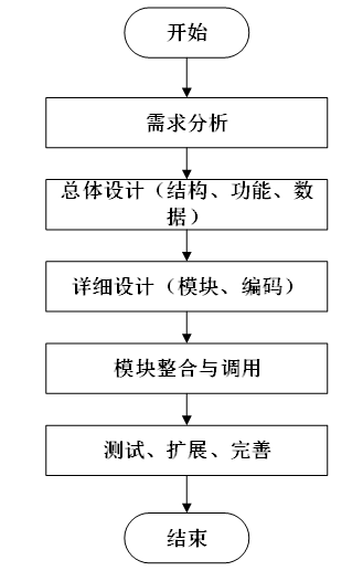 系统开发流程的主要步骤,从需求分析到系统完成的全过程。流程包括需求分析、总体设计(结构、功能、数据)、详细设计(模块、编码)、模块整合与调用,以及测试、扩展和完善,最终完成系统的开发。本系统的开发流程如图3-3所示