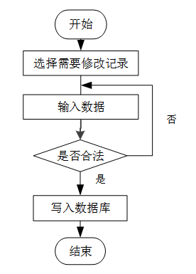 用户首先选择需要修改的记录,输入修改后的数据,系统判断输入数据是否合法。若数据不合法,提示重新输入;若数据合法,则将修改后的数据写入数据库,完成操作后流程结束。修改信息流程图如图3-7所示。