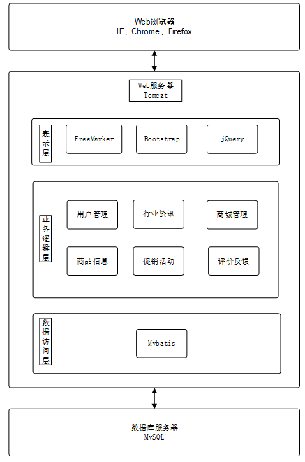 系统由表现层、业务逻辑层、数据访问层和数据库服务器组成。表现层通过浏览器(如IE、Chrome、Firefox)与用户交互,采用FreeMarker、Bootstrap、jQuery等技术实现界面呈现。业务逻辑层负责处理系统的核心业务逻辑,通过分模块设计实现功能分离。数据访问层使用MyBatis框架连接数据库,执行数据的增删改查操作。数据库服务器采用MySQL进行数据存储和管理,为系统提供稳定的数据库支持。整个架构通过Tomcat服务器完成用户请求的接收和处理,确保系统的高效运行[8]。整个系统架构如图4-1所示。