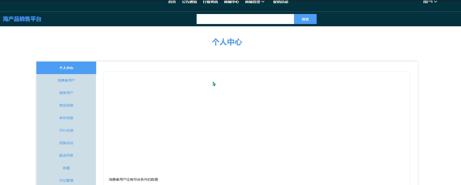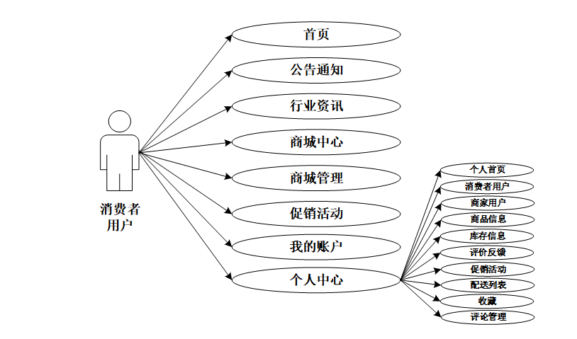 用户可查看首页、公告通知、行业资讯、商城中心、商城管娌、促销洁动、我的账户、个人中心(消费者用户、商家用户、商品信息、库存信息、评价反馈、促销活动、配送列表、收藏、评论管理)等。