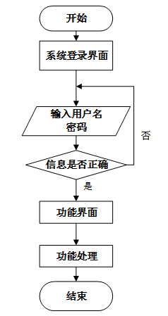 用户首先进入系统登录界面,输入用户名和密码后,系统验证信息是否正确。若验证失败,返回登录界面重新输入;若验证成功,则进入功能界面,执行相应功能处理后结束操作流程。操作流程如图3-5所示。