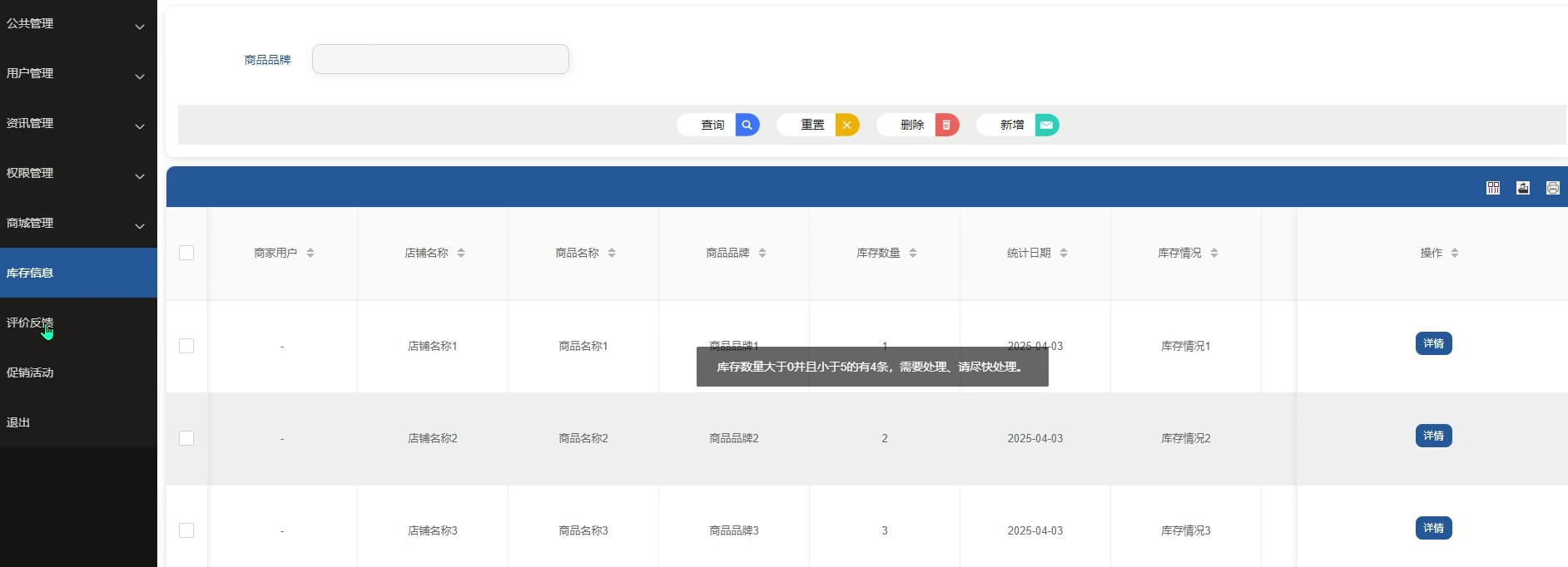 系统提供库存信息查看和调整功能,管理员可及时掌握商品库存状态,协助商家优化商品上架与补货策略。库存信息界面如图5-12所示。