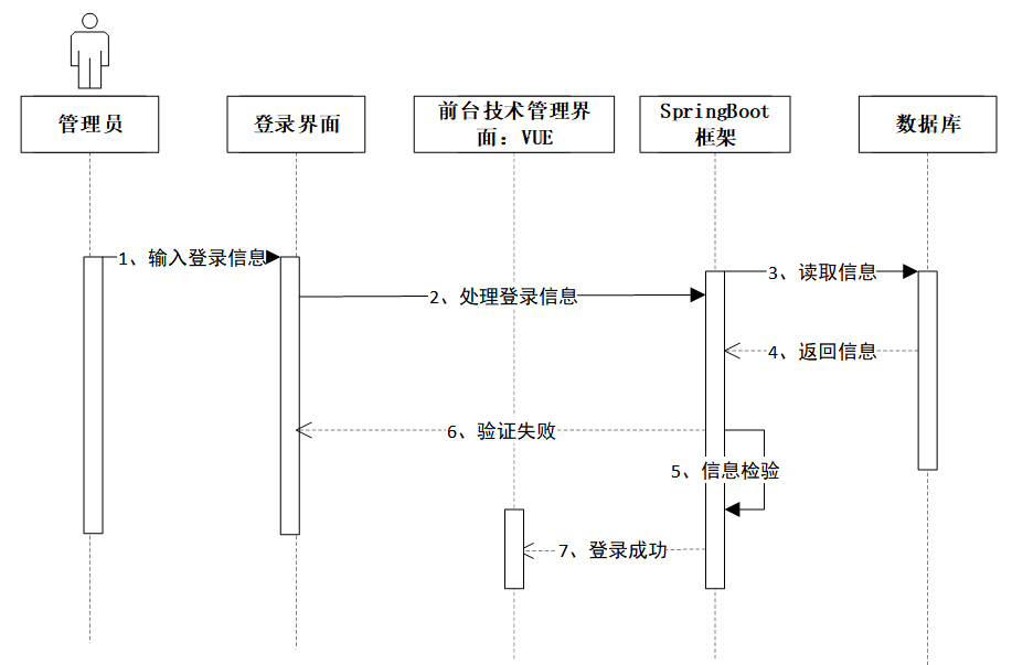 管理员输入登录信息后,登录界面将信息传递至前台管理界面,随后通过SpringBoot框架读取数据库中的用户信息并返回。系统验证信息,若验证成功则登录成功,若验证失败则返回错误提示。登录时序图如图4-4所示。