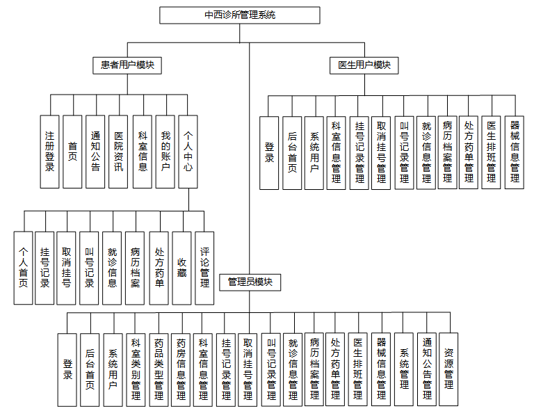 本中西诊所管理系统设计分为两个主要用户角色:患者用户、医生用户和管理员。以下是对每个角色的功能需求的详细描述。