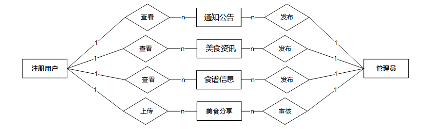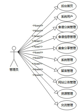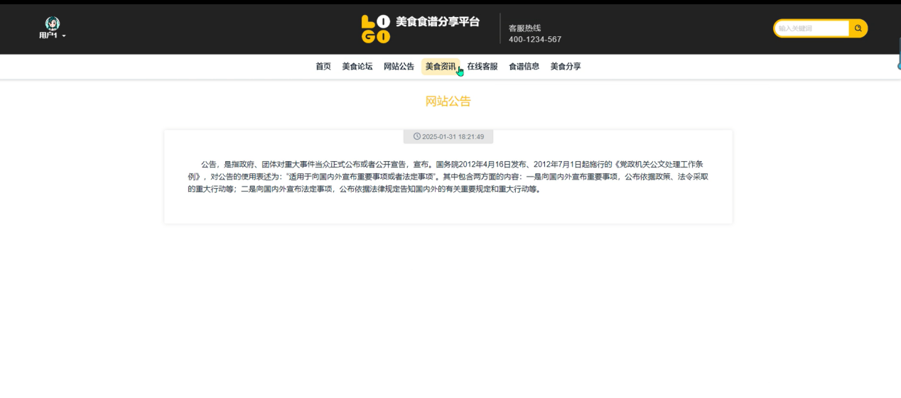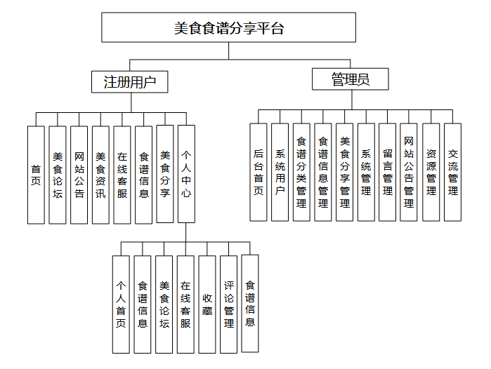 The main architecture of the platform includes multiple core components such as the homepage, food forum, personal center, food function module, online customer service system, and administrator backend. The homepage displays food information, recipe information, and food sharing, making it easy for users to quickly access the information they need; The food forum provides users with a platform to exchange food experiences and share cooking tips; The personal center allows users to manage personal information, collect recipes, and view comment records; The food function module covers rich recipe resources, the latest food information, and convenient sharing functions; The online customer service system can provide users with instant consultation and support; The administrator backend is responsible for comprehensive website operation and management, including user information management, recipe classification and information management, food sharing content review, announcement publishing, resource management, message processing, and forum monitoring.